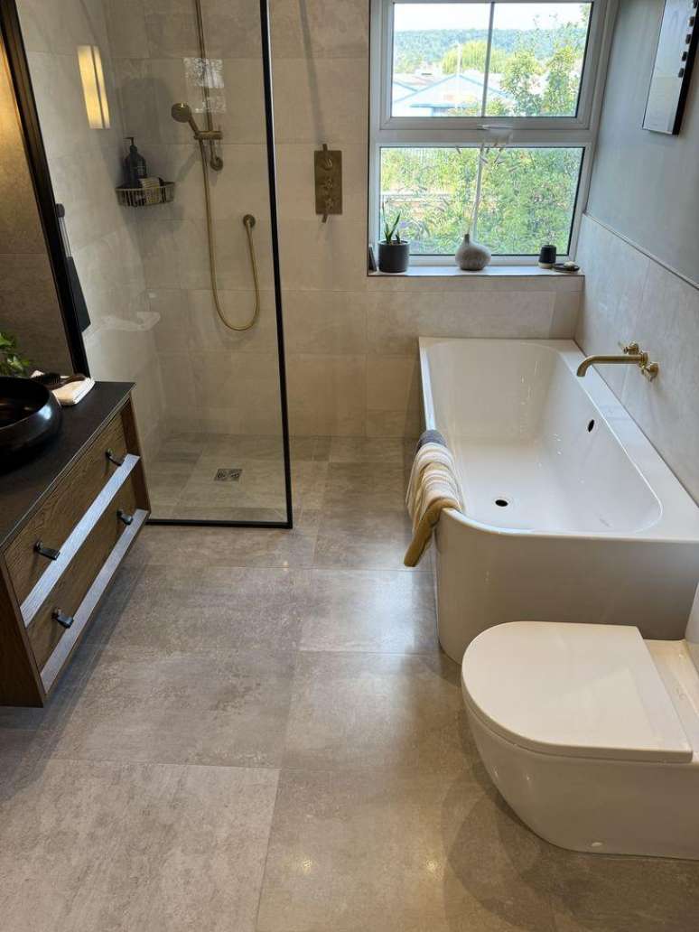 O efeito é especialmente positivo em banheiros pequenos. A ausência de barreiras visuais ajuda a ampliar o espaço de forma simples e elegante.