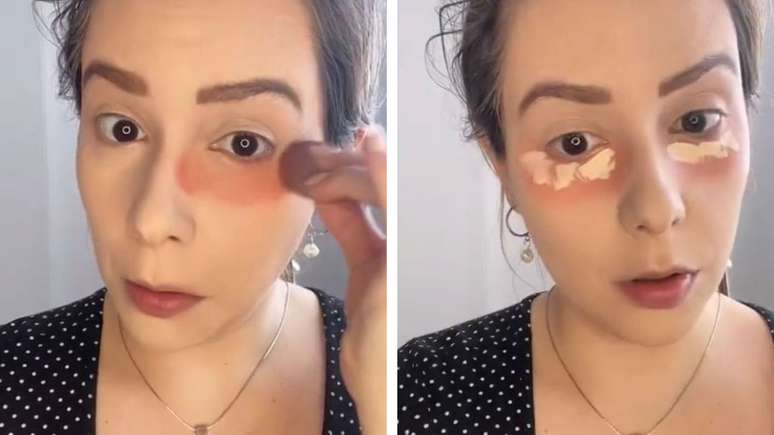 Esse truque viralizou há pouco tempo e está em praticamente todos os perfis de beleza. Afinal, as olheiras são um incômodo enfrentado por muita gente, né? Para disfarçá-las, a proposta é, primeiro, cobri-las com blush rosado e, depois, finalizar com corretivo em tom mais claro. Fim das manchas!