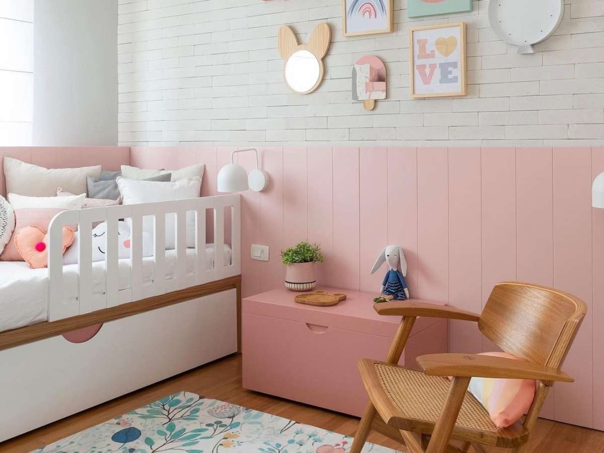 Neste projeto do escritório Duda Senna Arquitetura, o rosa pastel entrou para ganhar a cena. Ele tinge os lambris ripados que contornam a caminha e compõe com um baú laqueado exatamente no mesmo tom. O tapete com cores suaves e os quadrinhos completam a decoração.