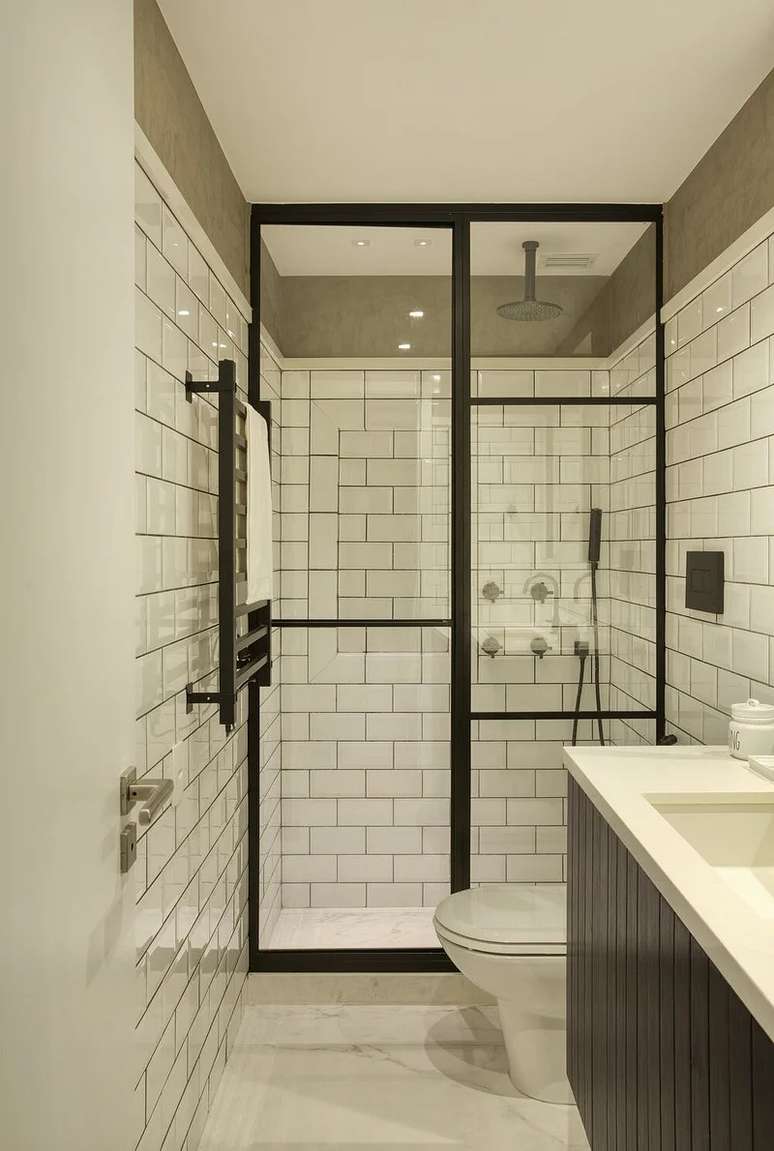 O clássico banheiro branco, mas nem tanto. Neste projeto do Studio Ro+Ca, apesar do ambiente branco, os revestimentos no estilo metrô trouxeram personalidade e combinados à presença do ferro e detalhes pretos, reforçam o estilo industrial. O recorte na parte superior das paredes coberto com cinza trazem a sensação de que o cômodo é maior.