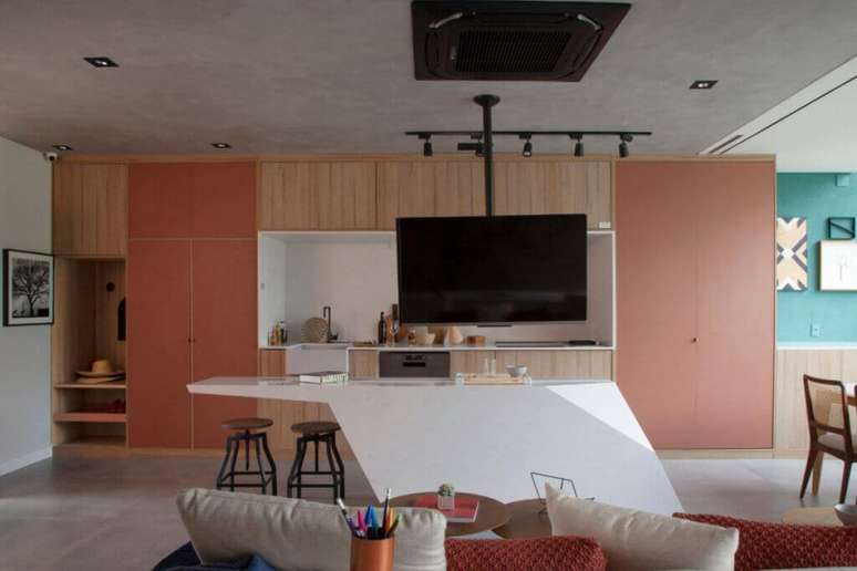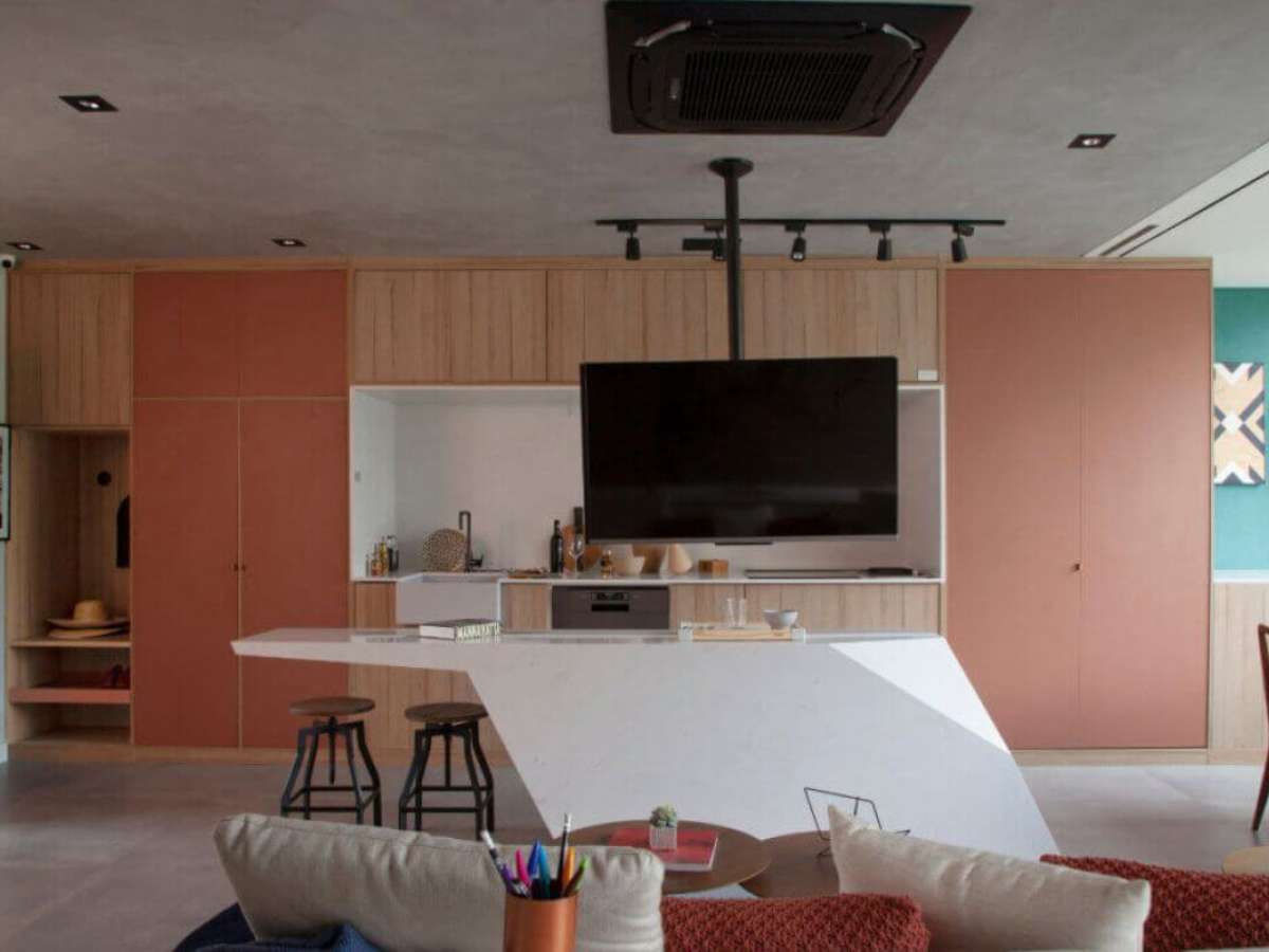 Móveis e ambientes multifuncionais são excelentes opções para quem viverá em um apartamento pequeno. Entre as soluções desenvolvidas pelo escritório do arquiteto Bruno Moraes, o móvel posicionado nas costas do sofá atua como bar e bancada de trabalho. Com uma planta integrada, as discretas portas em madeira ripada camuflam o guarda-roupa.