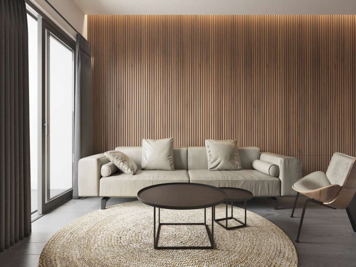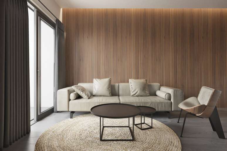 O painel ripado pode dividir o protagonismo com a textura do tapete, com o uso de plantas na decoração e para reforçar a sensação de conforto. Uma dica importante é a sala harmônica, com elementos naturais e cores claras, por exemplo, para promover uma sensação de amplitude.