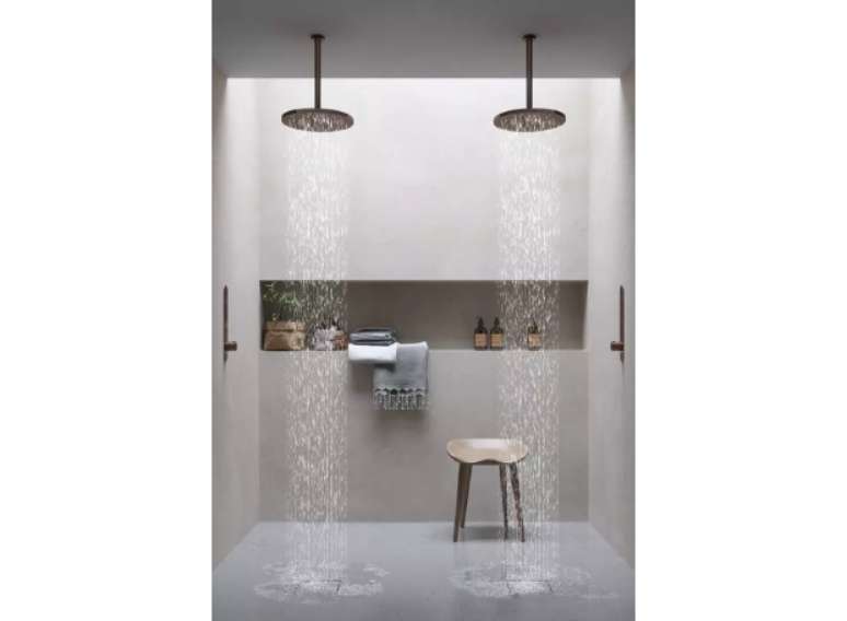 Você pode testar, por exemplo, chuveiros horizontais, os de teto ou nas paredes, aqueles de efeito de chuva, os com luzes coloridas e ousadas, paredes revestidas por pedras ou azulejos, janelas que miram o exterior… O que fizer mais sentido para o seu estilo de vida e expectativa com o ambiente.
