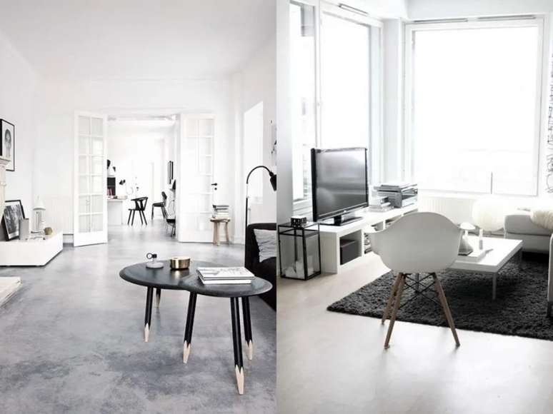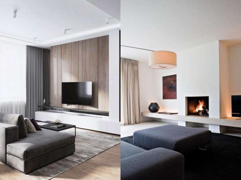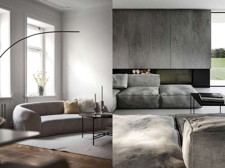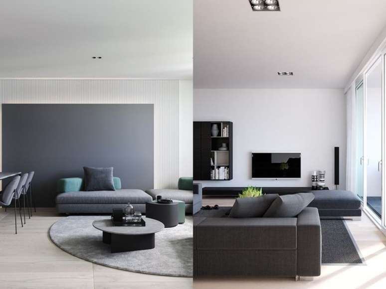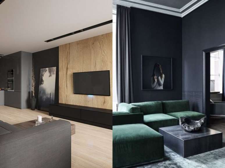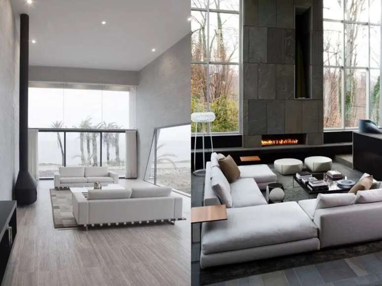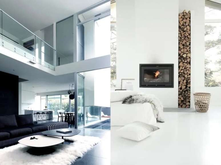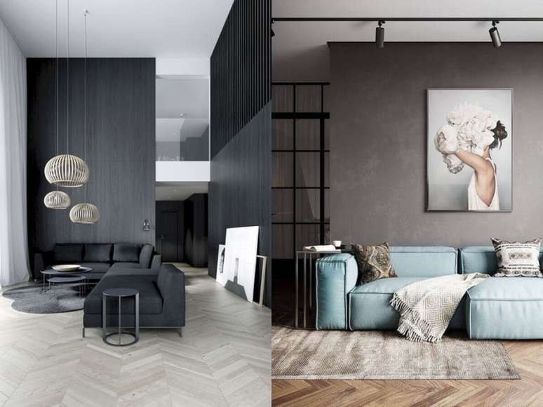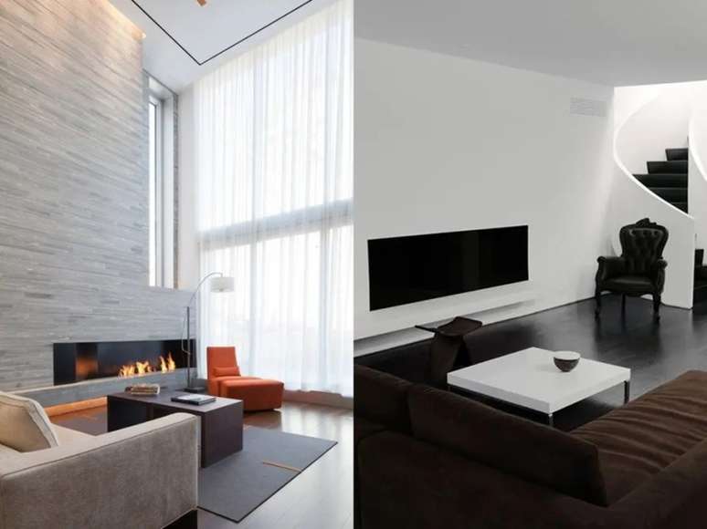 Cinza e preto podem ser usados para contraste: uma parede, teto ou móveis de destaque, você também pode acentuar sua lareira com preto.