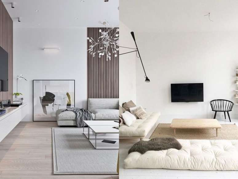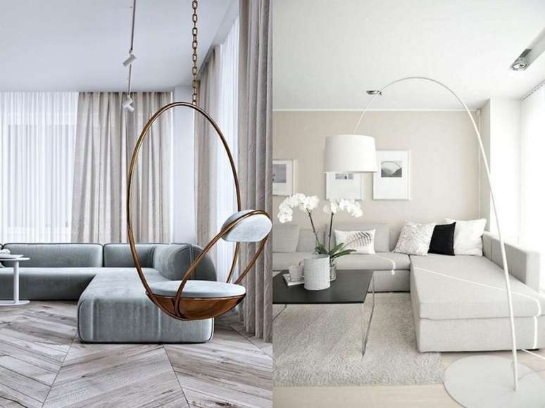 Um sofá ou uma namoradeira é indispensável para uma sala de estar, você pode adicionar cadeiras ou poltronas, mas todas elas com um design simples. Algumas mesas de centro minimalistas serão uma boa ideia para sua sala de estar. Espreguiçadeiras e cadeiras suspensas são opcionais - se você as ama, e armário devem ser muito elegantes ou até mesmo movidas para outros espaços.