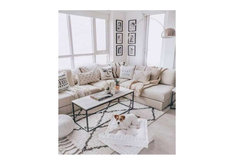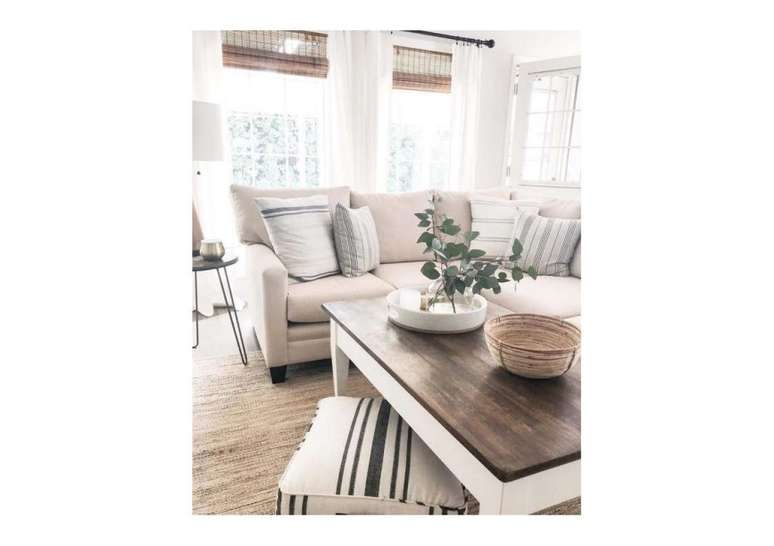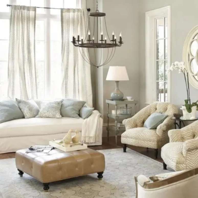 Experimente tons quentes e neutros, como branco, bege, dourado e marrom, e complemente tudo com um único ponto focal que usa tons frios contrastantes. Pode ser uma obra de arte, um item de mobília, um tapete ou uma luminária.