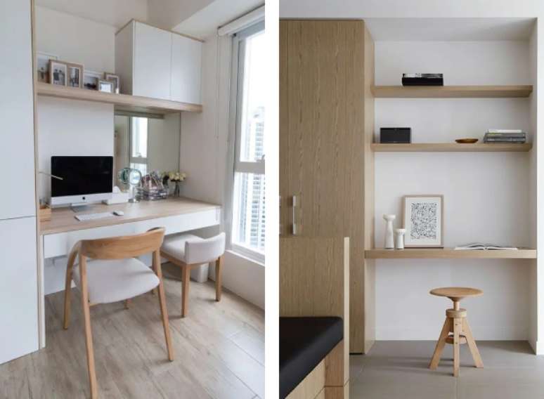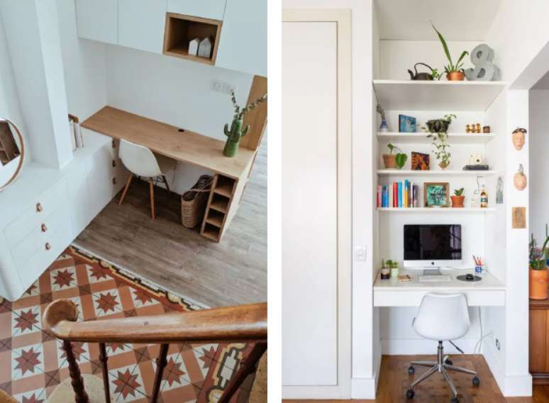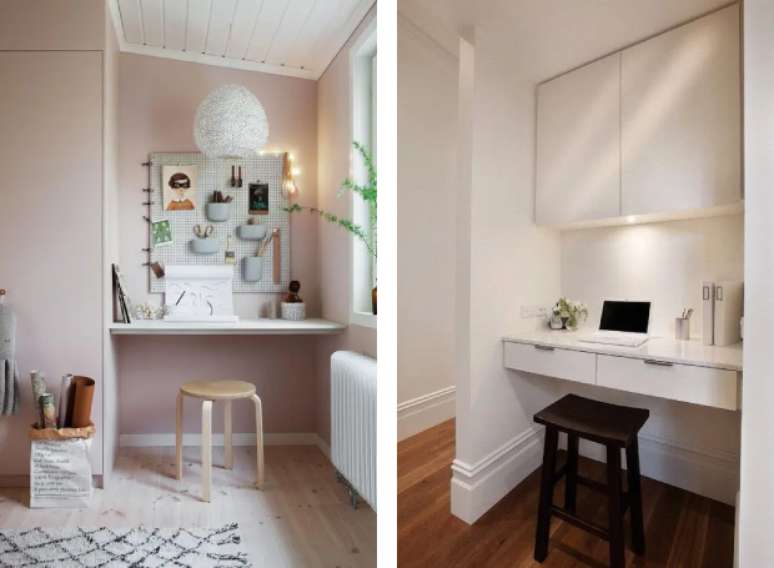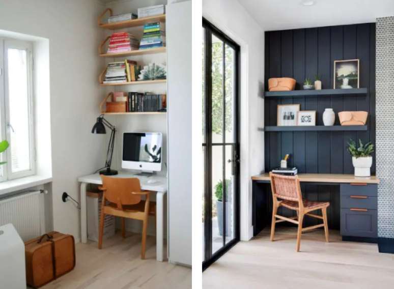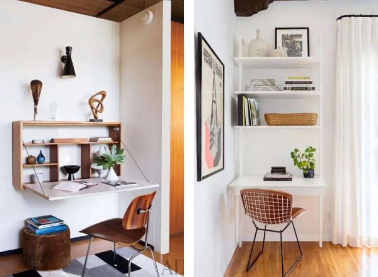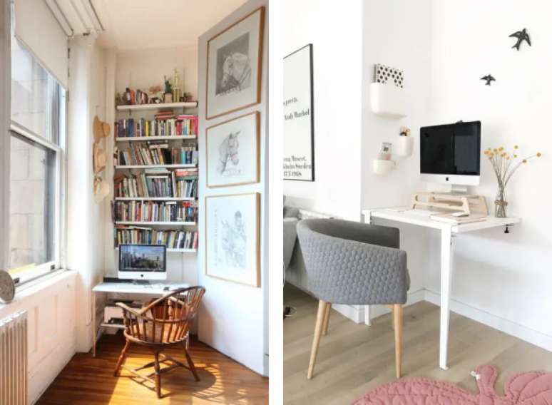Além disso, vale procurar por mesas pequenas ou uma estante que inclua uma tábua que sirva de mesa. Prateleiras e mesas flutuantes podem ser outro bom exemplo de solução do problema do espaço.