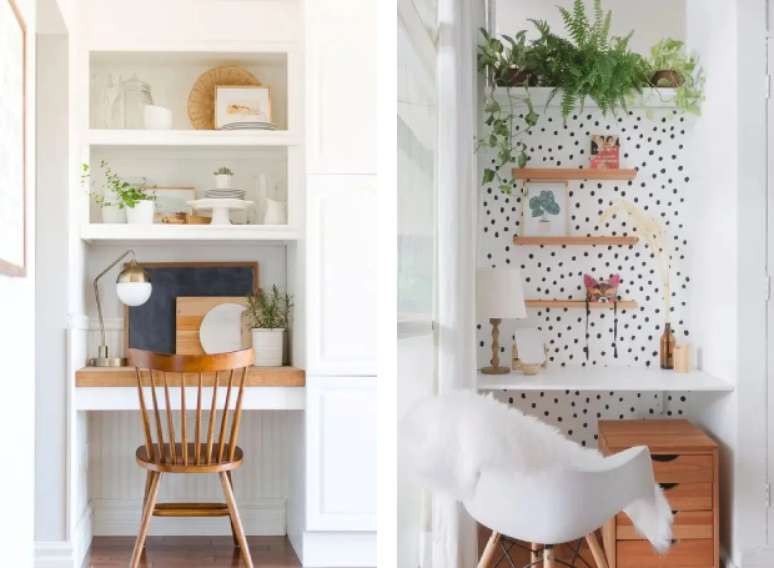 Planeje o tamanho do seu pequeno nicho e decida como você o organizará para cumprir todas as funções. Geralmente isso implica em prateleiras embutidas e uma mesa combinando com a largura do seu nicho.