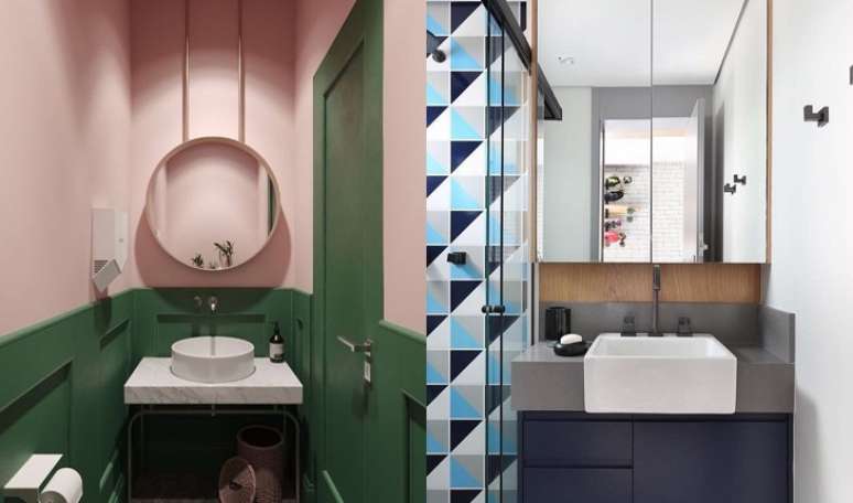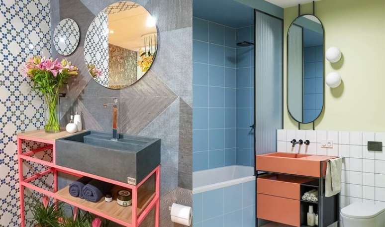 Uma das maiores tendências do Pinterest são os banheiros coloridos. E a ideia aqui é apostar em cores diferentes e fazer várias misturas, valendo, até mesmo, para as paredes do box. Se quiser ser mais discreto, aposte em objetos e azulejos com detalhes em tons vibrantes para a decoração.