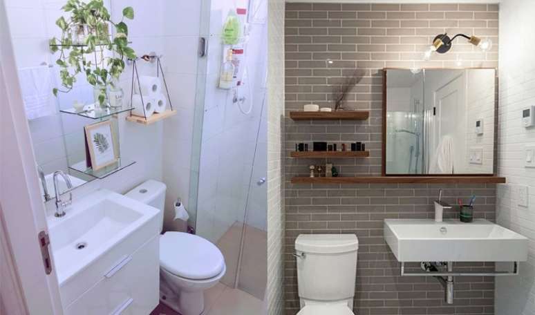 Além das caixas, outra opção são as prateleiras. Práticas, elas são perfeitas para guardar cosméticos, papel higiênico e até pendurar plantas. O ideal é investir em modelos diferentes para fugir do tradicional. Aposte nas feitas de madeira, ou se quiser ser mais sofisticado, vidro.