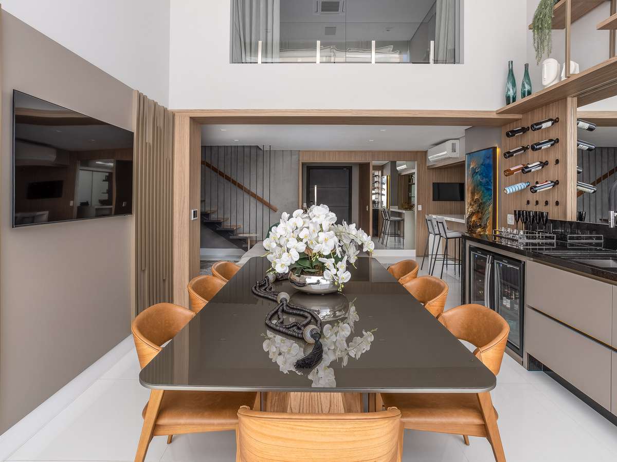 Super alinhada com a área social, a sala de jantar pode estar integrada com outros ambientes como sala de estar e varanda. Aliás, essa sintonia está cada vez mais presente, tanto em imóveis compactos, como os mais amplos, sempre com o intuito de propiciar mais espaço e permitir a fluidez, convívio entre as pessoas, além da circulação de ar e luz natural.