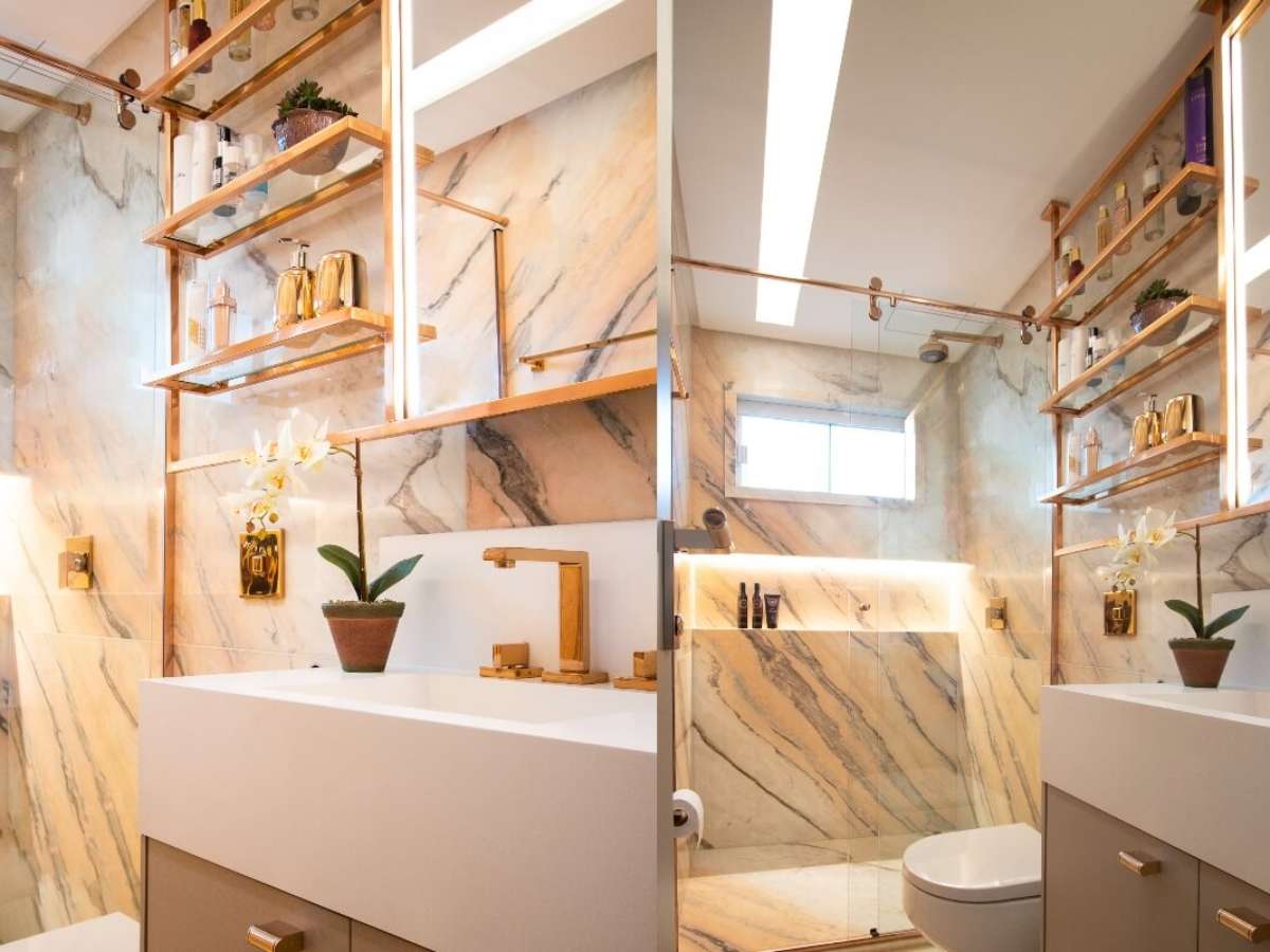 Todo espaço é útil e, nessa perspectiva, nichos e prateleiras nas paredes ajudam a aproveitar cantinhos que muitas vezes ficariam inutilizados. Esses materiais ocupam menos espaço e podem servir para acomodar itens de higiene, cosméticos, toalhas e até mesmo pequenos objetos decorativos.