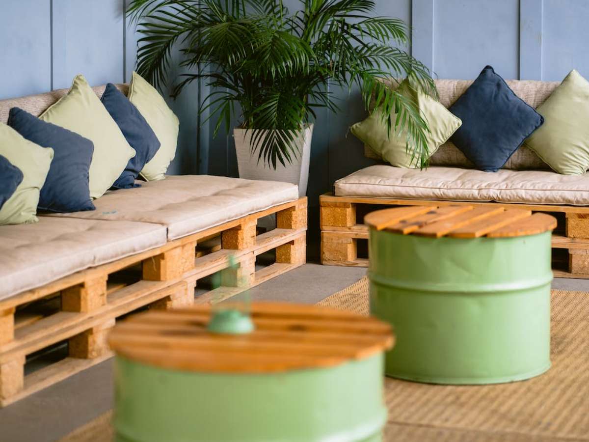 Paletes são versáteis e com baixo custo. Eles são uma escolha certeira se você quer criar um local para descansar na varanda. Acrescente almofadas e mantas para dar aquele aconchego e pronto! Se quiser dar um passo além pode pendurar fairy lights (aquelas de Natal) para uma atmosfera zen.