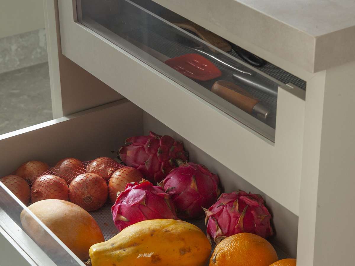 Por esses fatores, a dupla do Studio Tan-gram é adepta da marcenaria planejada para incluir a fruteira. Junto com a decisão pelo melhor local para a instalação da gaveta, recomendam a utilização de uma boa ferragem para assegurar a abertura completa da gaveta, sem se preocupar com a movimentação e o peso.