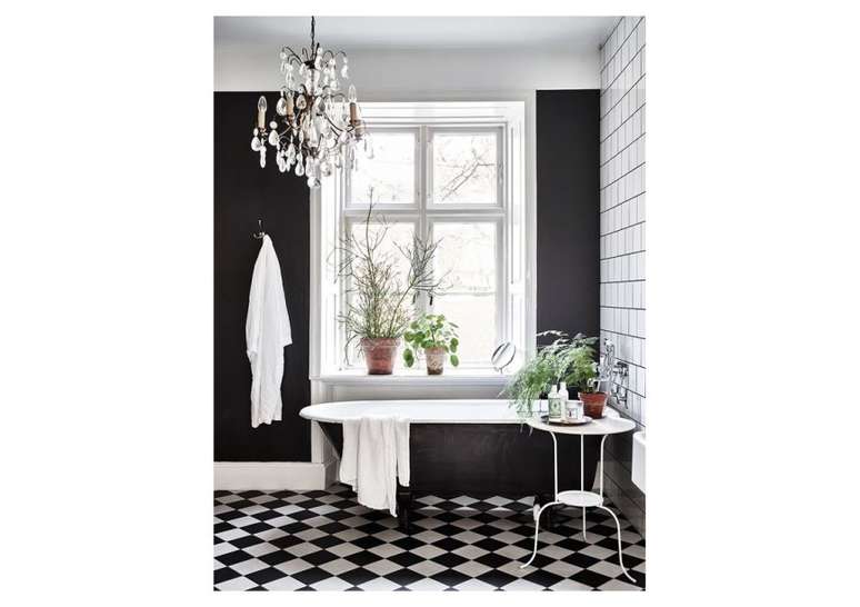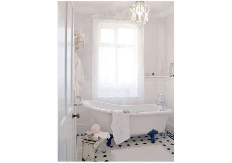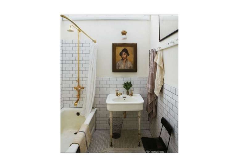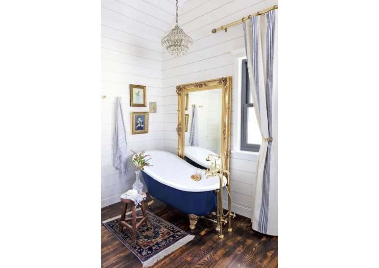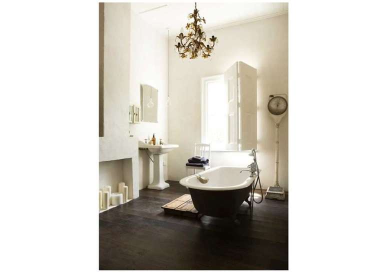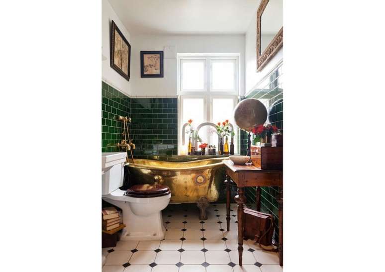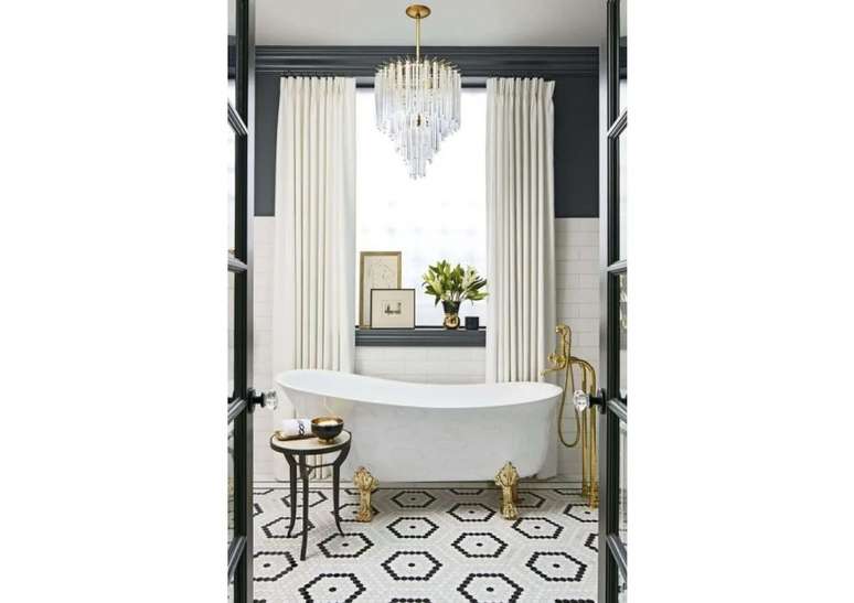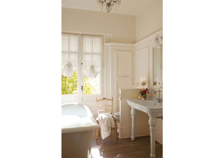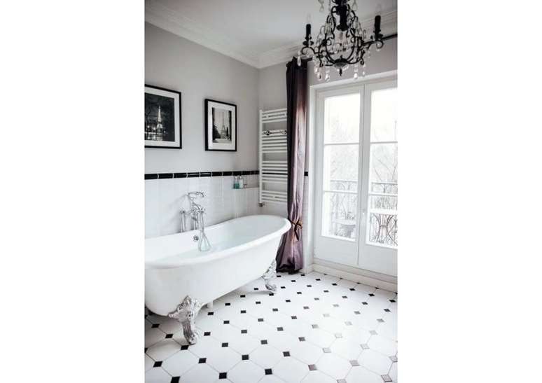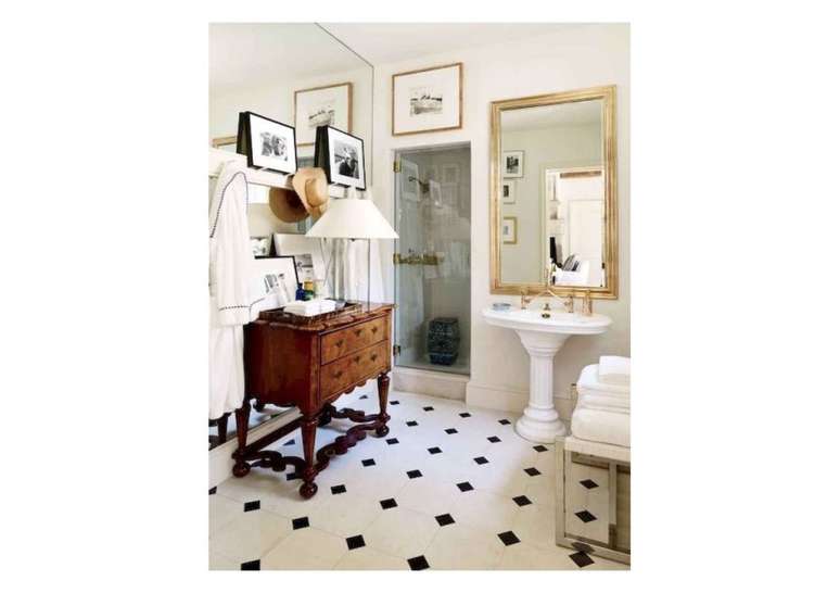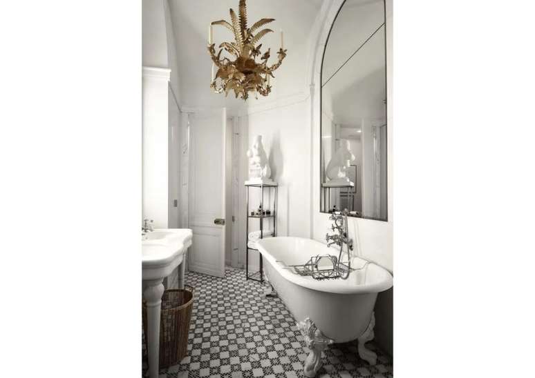 Use pias de pedestal de porcelana se você não estiver apertado no espaço; opte por torneiras com alças de porcelana ou latão. Uma banheira com pés de garra é uma obrigação e vai ser a estrela do ambiente.