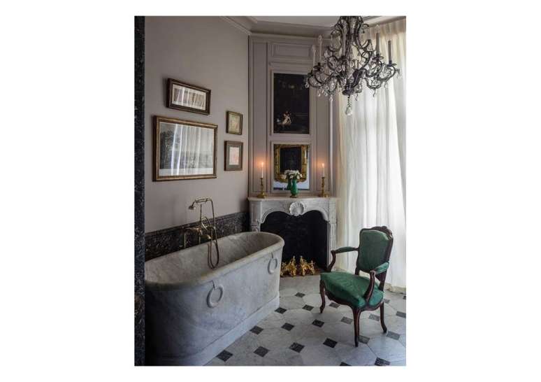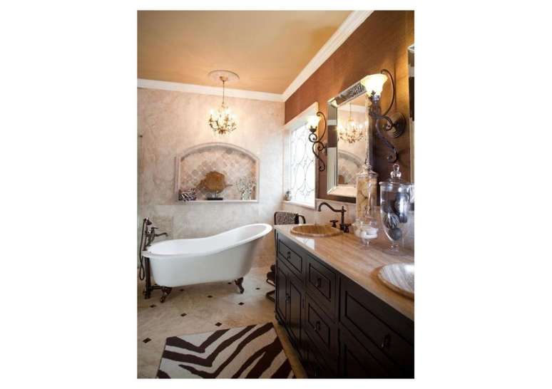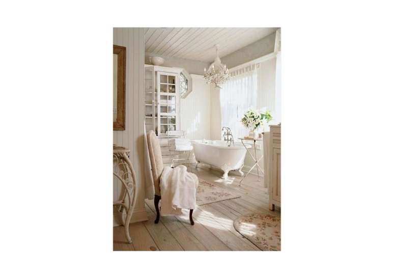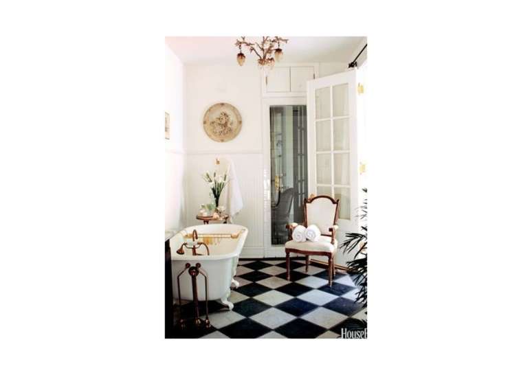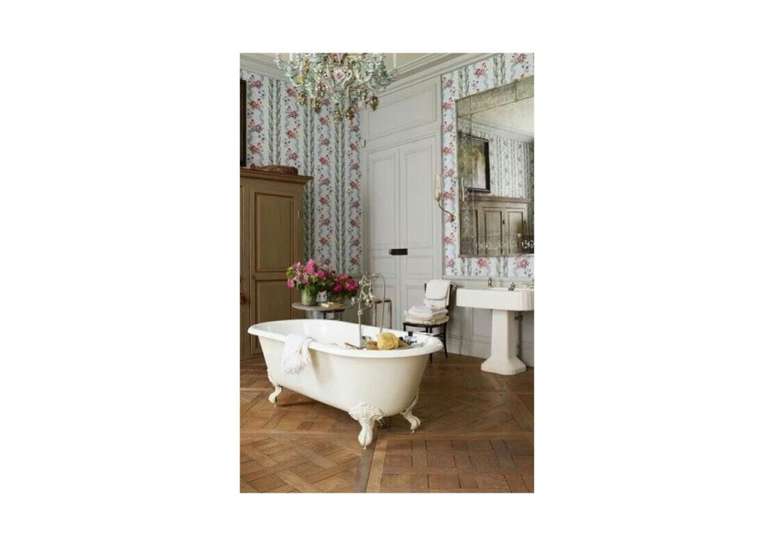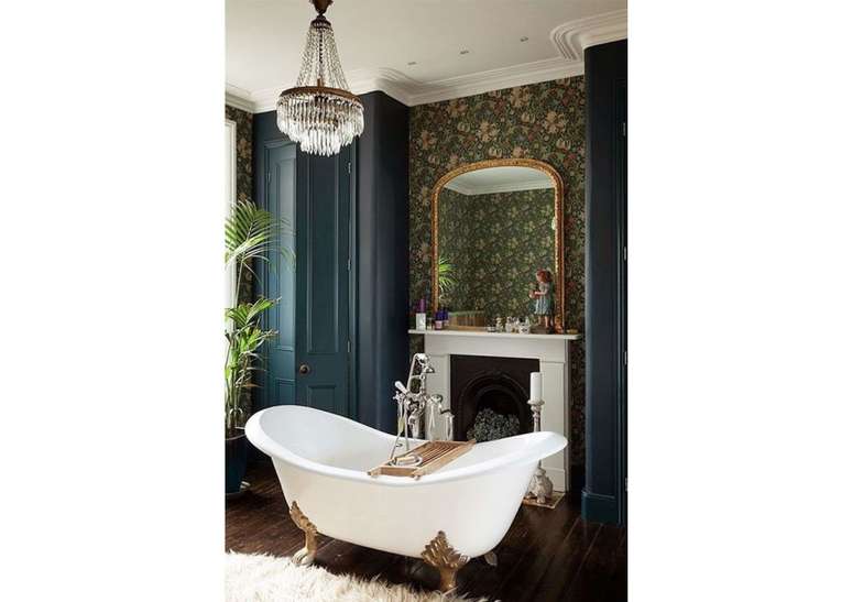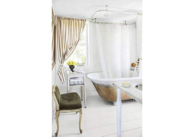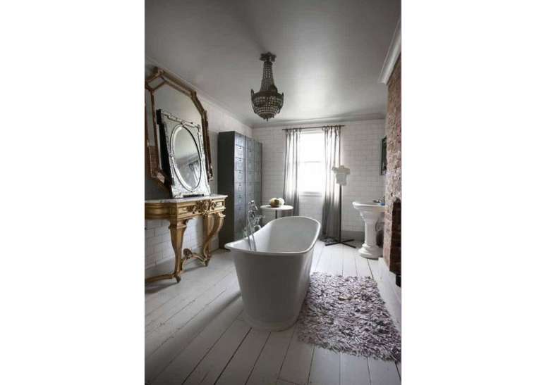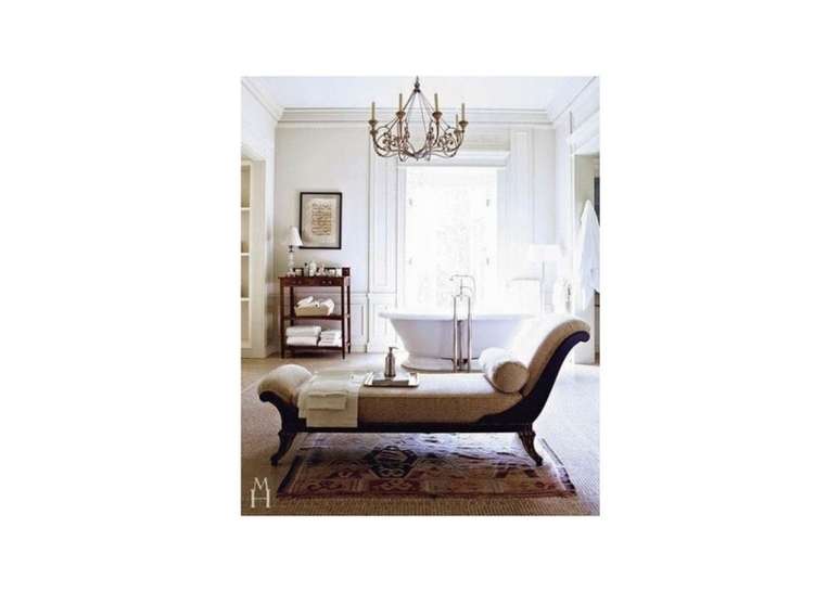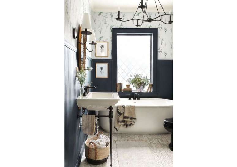 Use pias de pedestal de porcelana se você não estiver apertado no espaço; opte por torneiras com alças de porcelana ou latão. Uma banheira com pés de garra é uma obrigação e vai ser a estrela do ambiente.