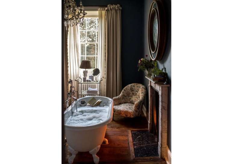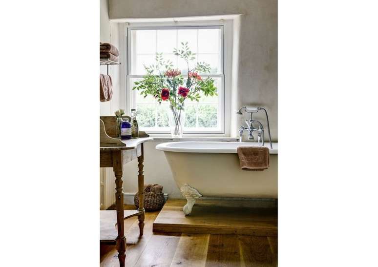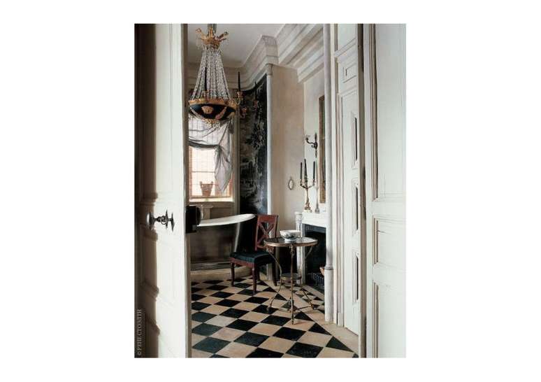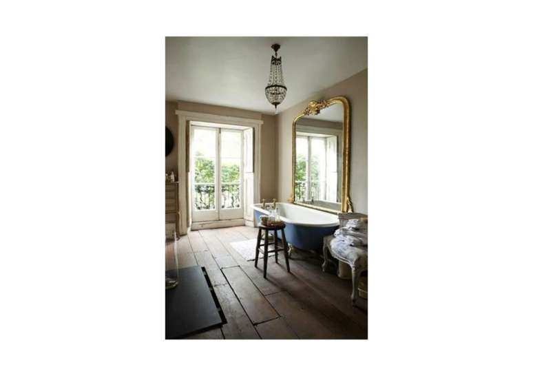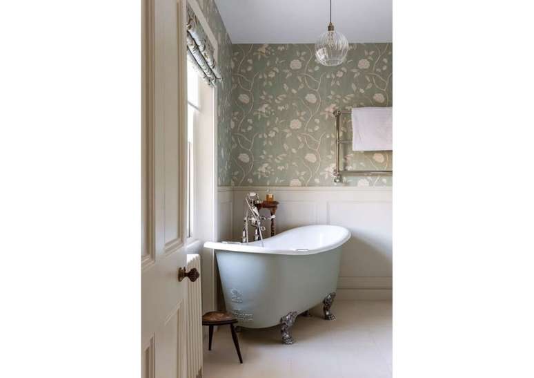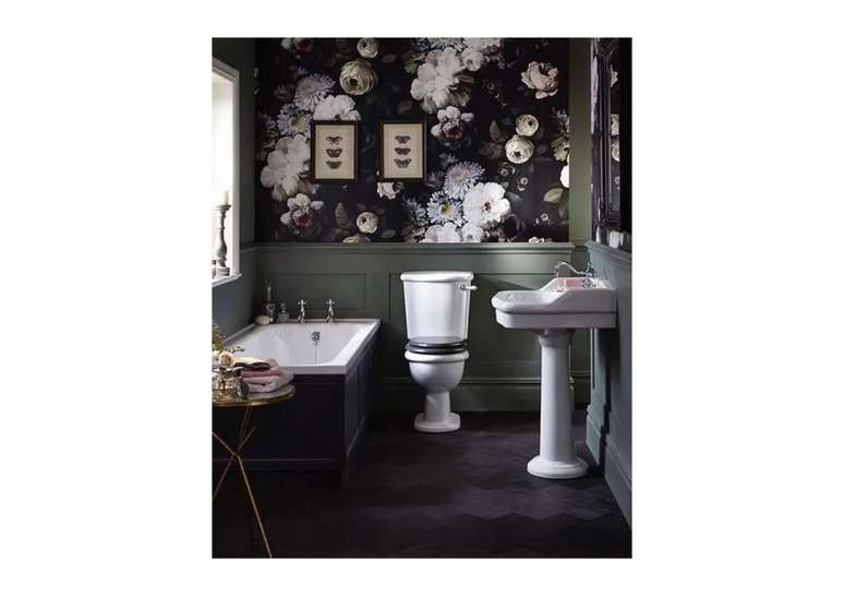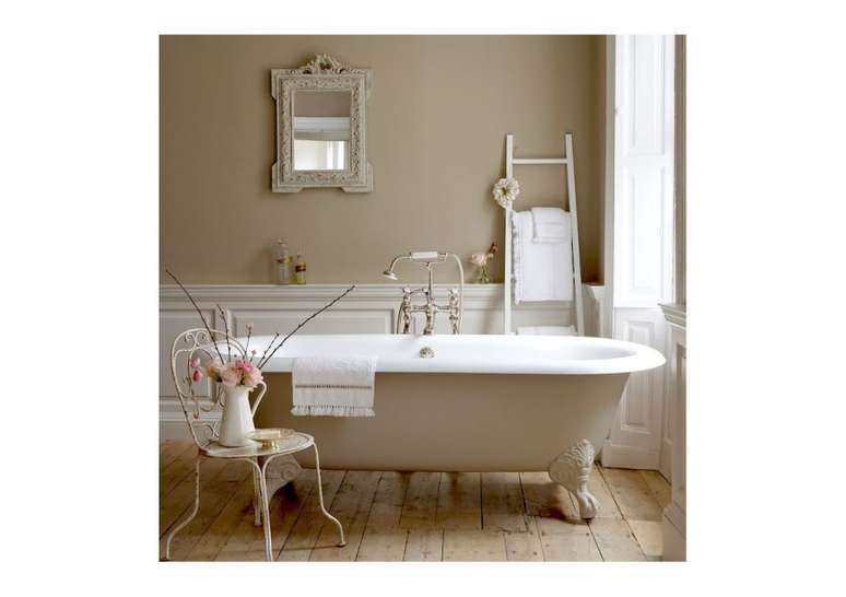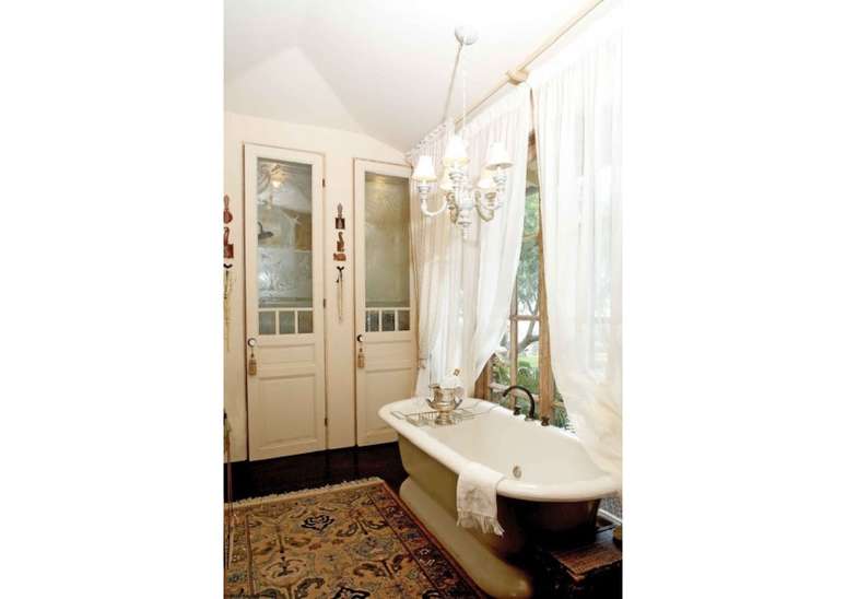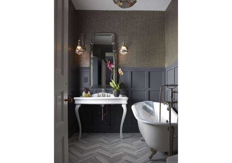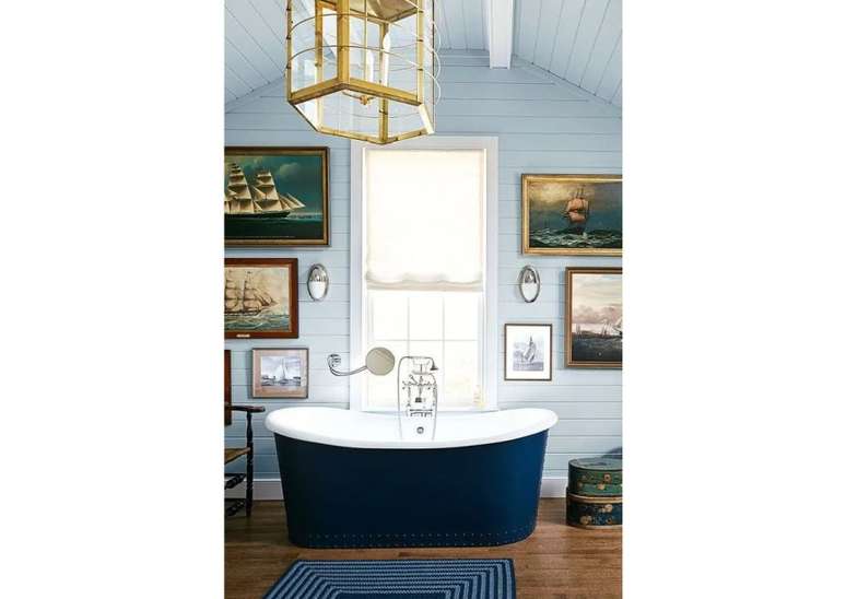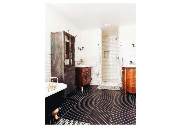 Use pias de pedestal de porcelana se você não estiver apertado no espaço; opte por torneiras com alças de porcelana ou latão. Uma banheira com pés de garra é uma obrigação e vai ser a estrela do ambiente.