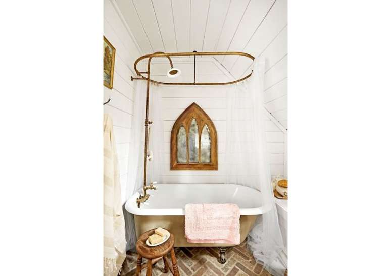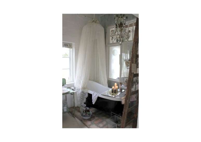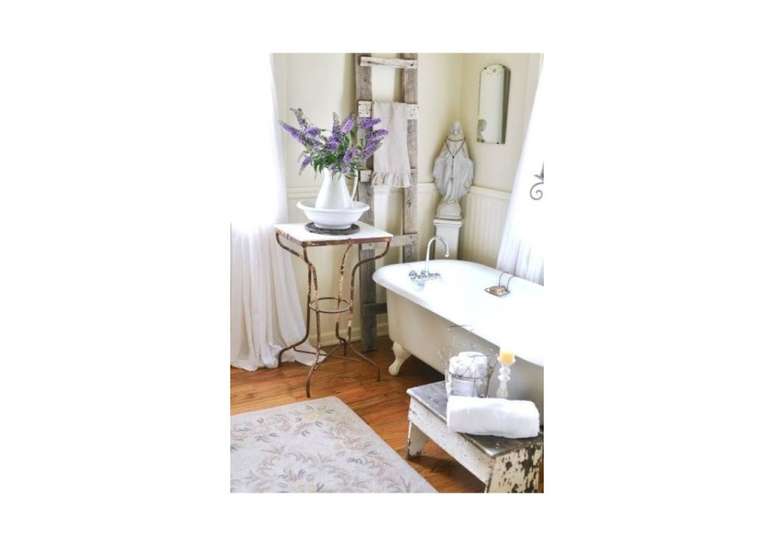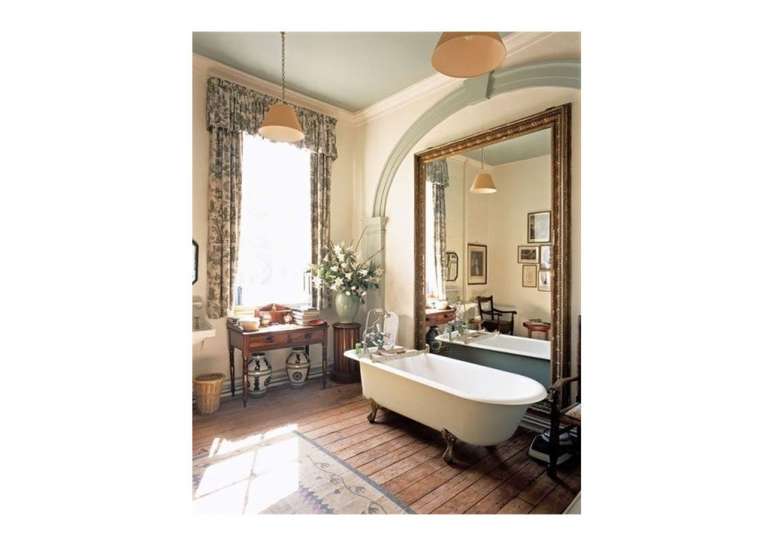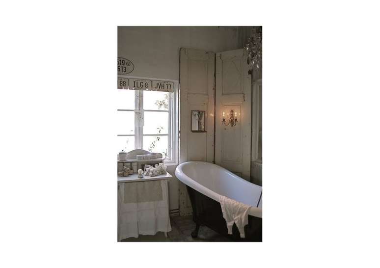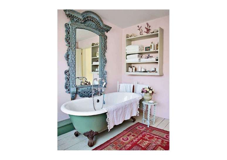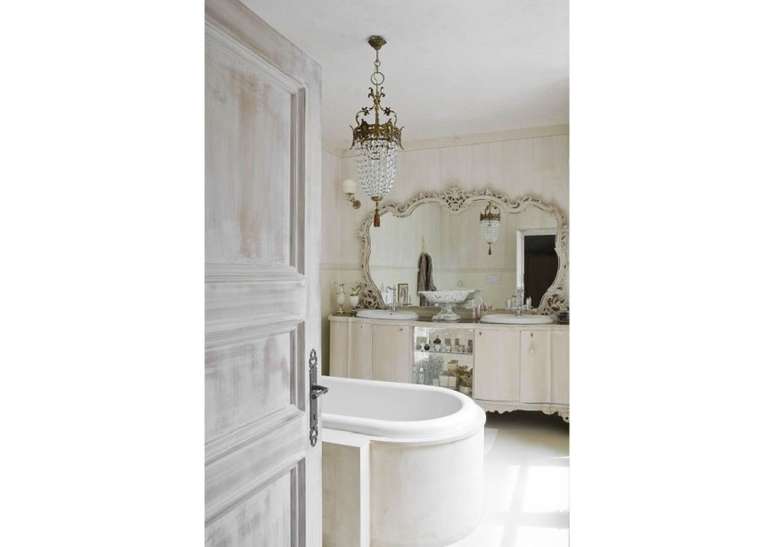 Para o espelho, use uma moldura de madeira pintada de branco lascado, uma rústica de madeira crua, ou vá com espelhos que tenham uma moldura mais antiga, refinada e ornamentada.