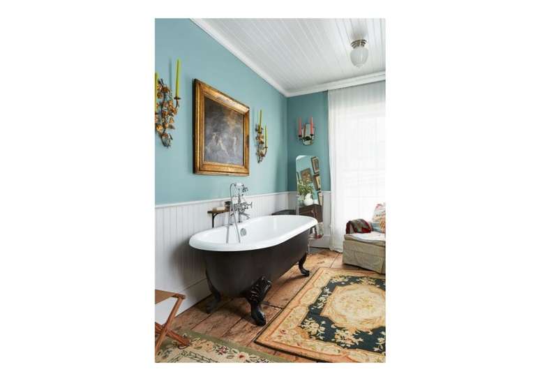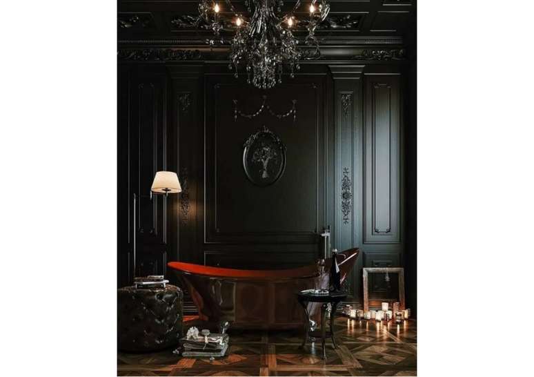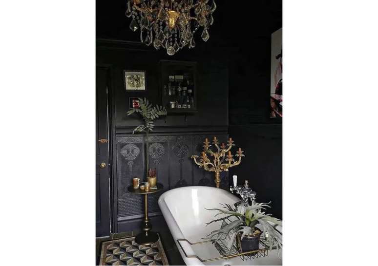 Banheiro com banheira vintage de pés de garra, o lado externo é preto e o interno branco.