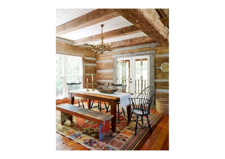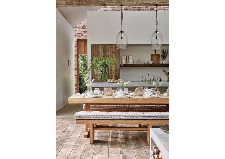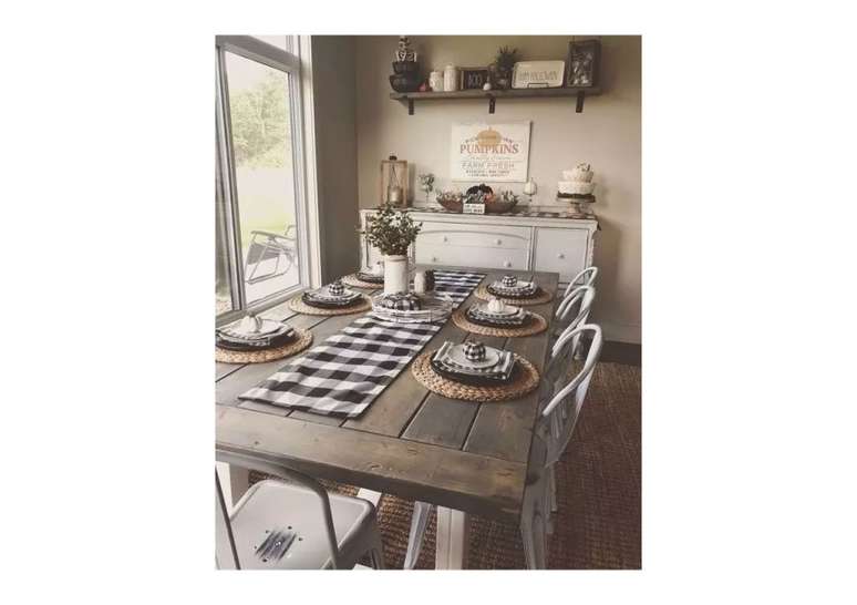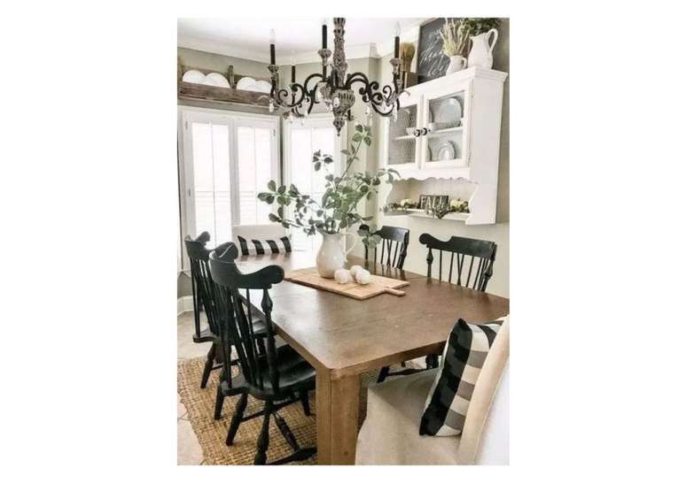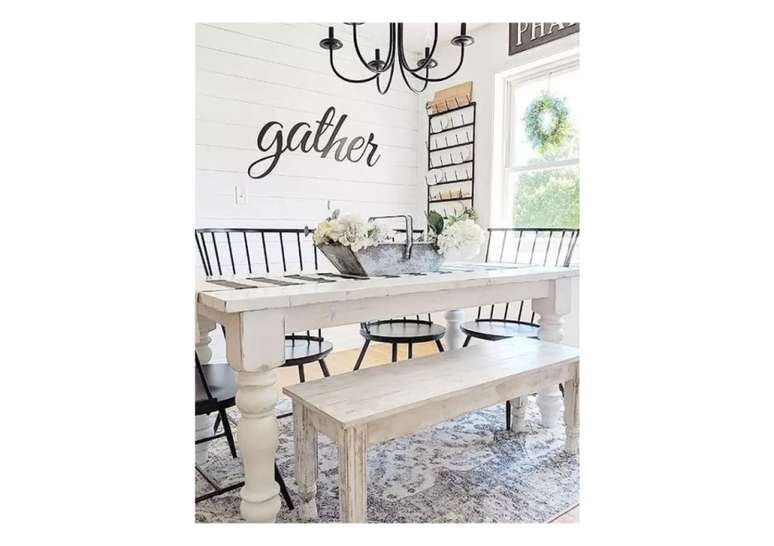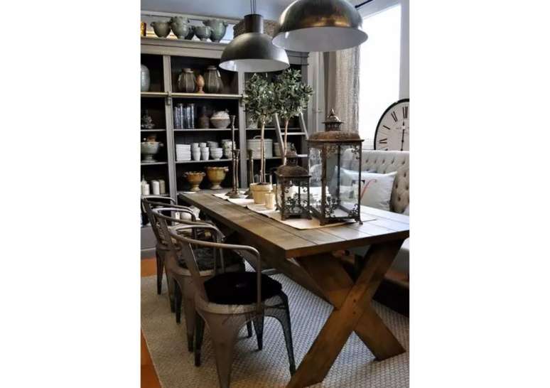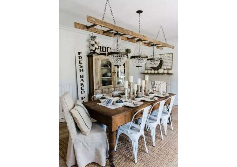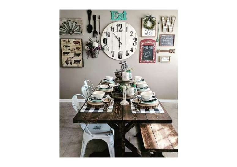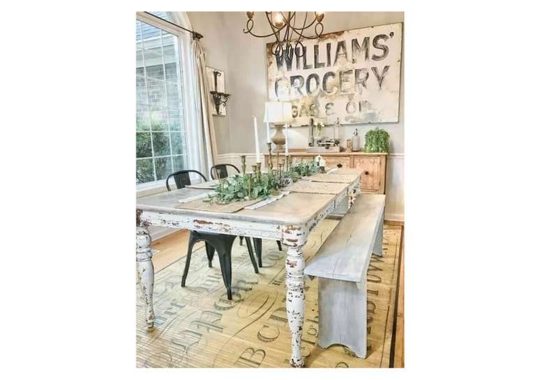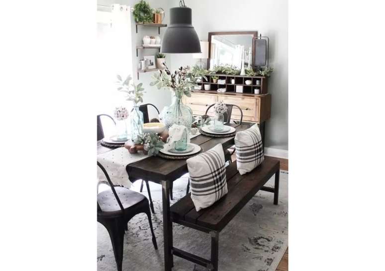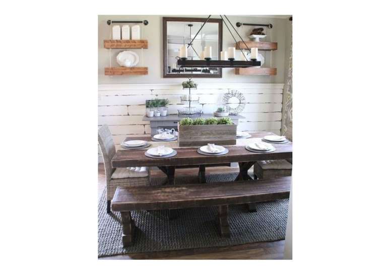 A primeira coisa que você vai precisar é de uma mesa de jantar com bastante textura. As cadeiras podem combinar ou não, você pode optar por assentos acolchoados ou normais com com almofadas confortáveis. Fora isso, um banco que combine com a mesa é sempre bem-vindo.