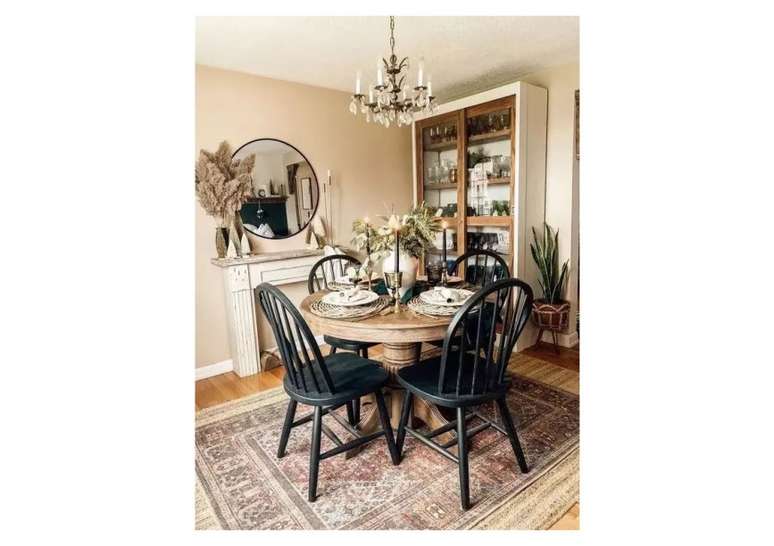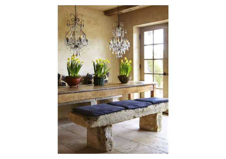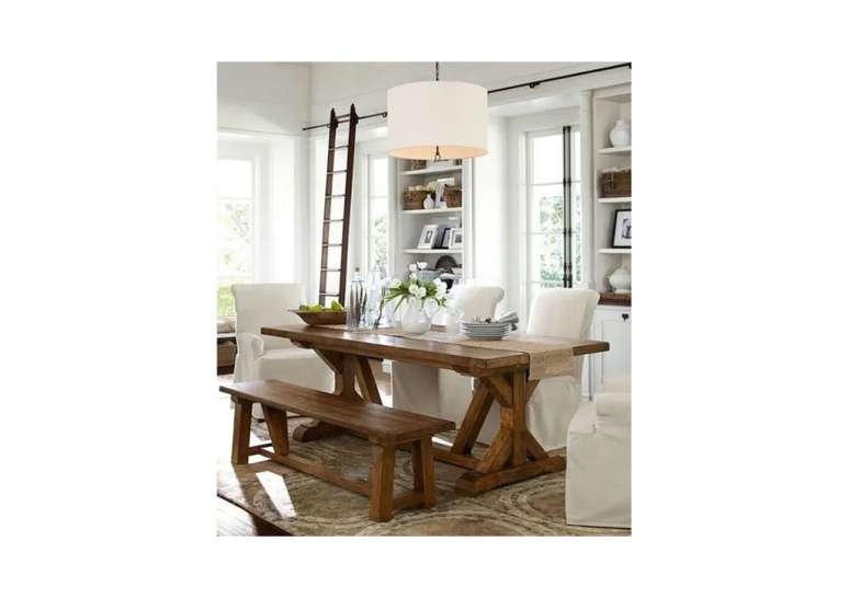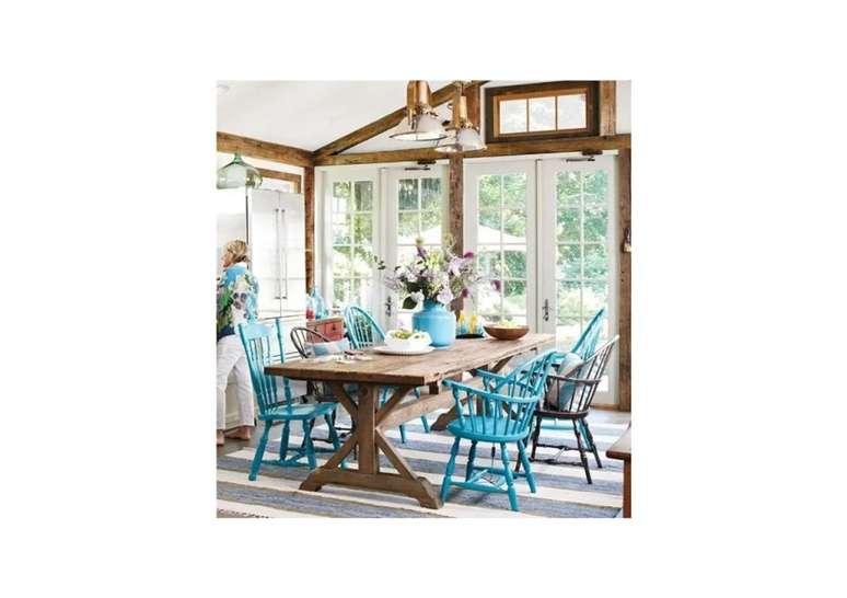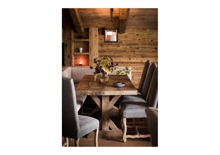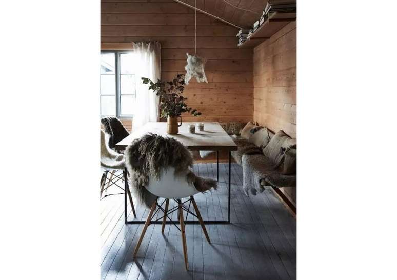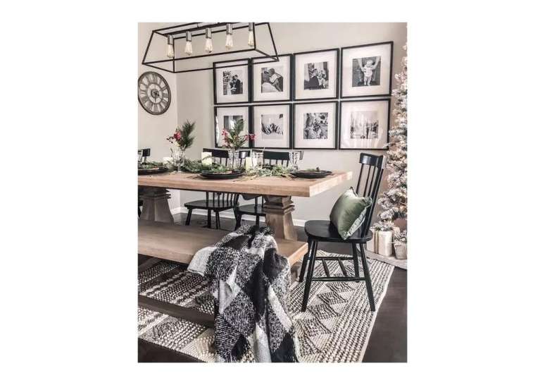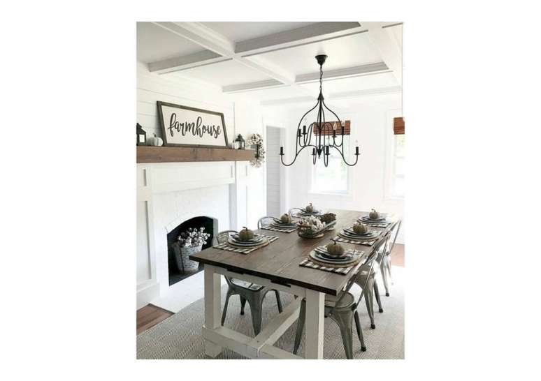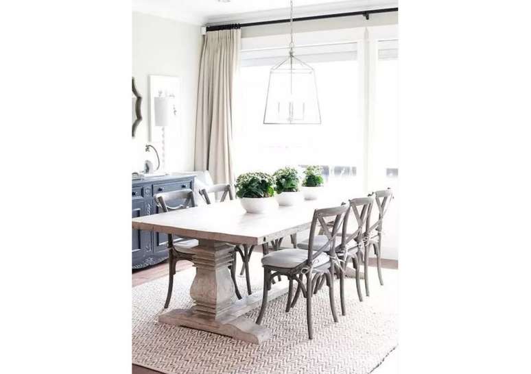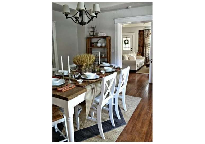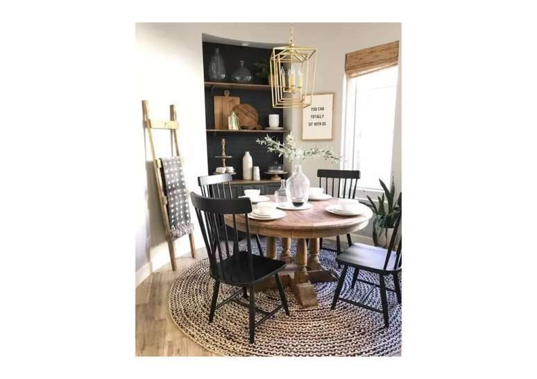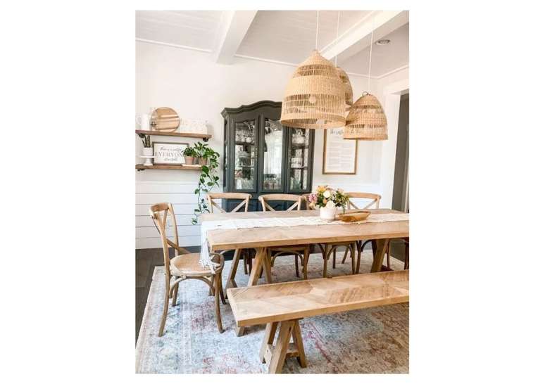 A primeira coisa que você vai precisar é de uma mesa de jantar com bastante textura. As cadeiras podem combinar ou não, você pode optar por assentos acolchoados ou normais com com almofadas confortáveis. Fora isso, um banco que combine com a mesa é sempre bem-vindo.