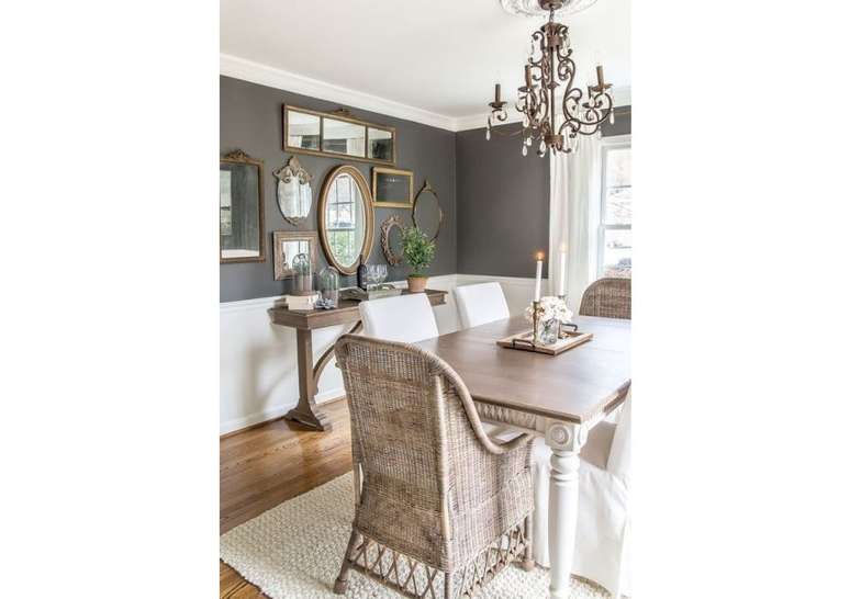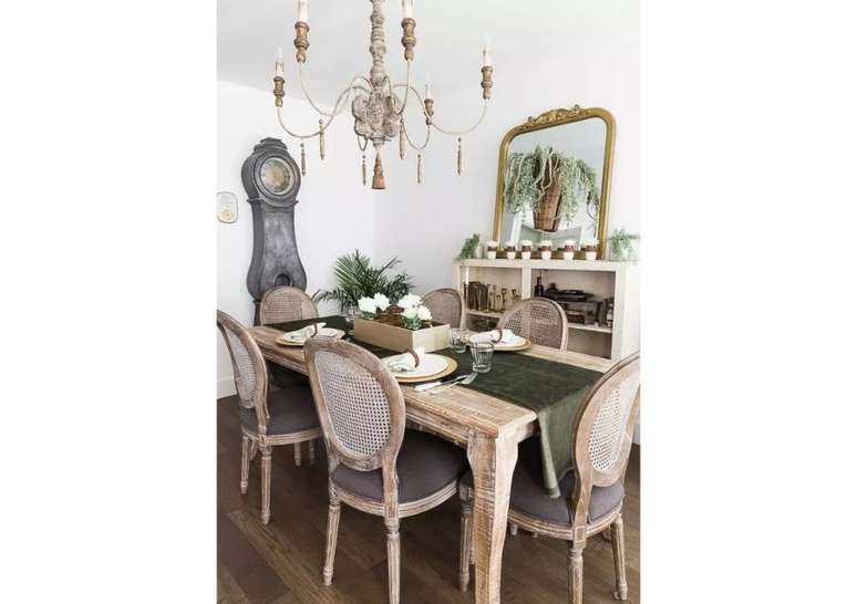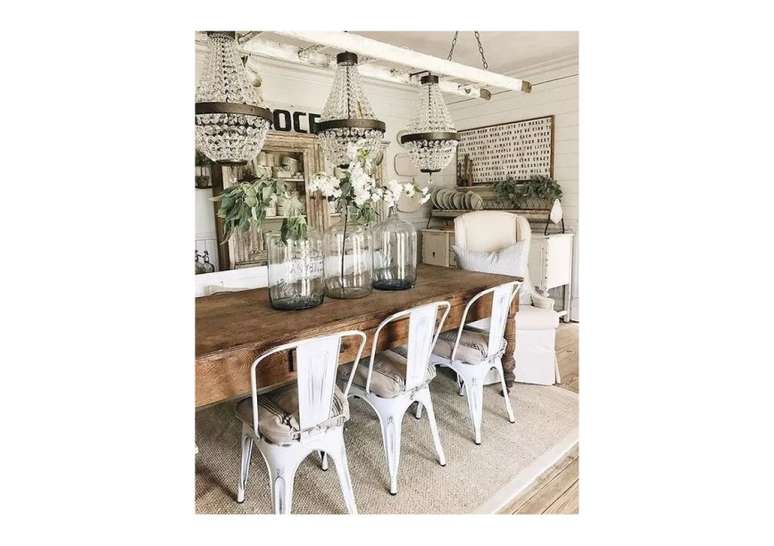 Opte por um lindo buffet rústico ou aparador no espaço, personalize-o com uma parede de quadros (pode ser decorada por pratos estampados também). Experimente ainda vasos de plantas e flores, escolha cestas para armazenamento e pendure lindos candelabros de cristal. Veja mais ideias abaixo!