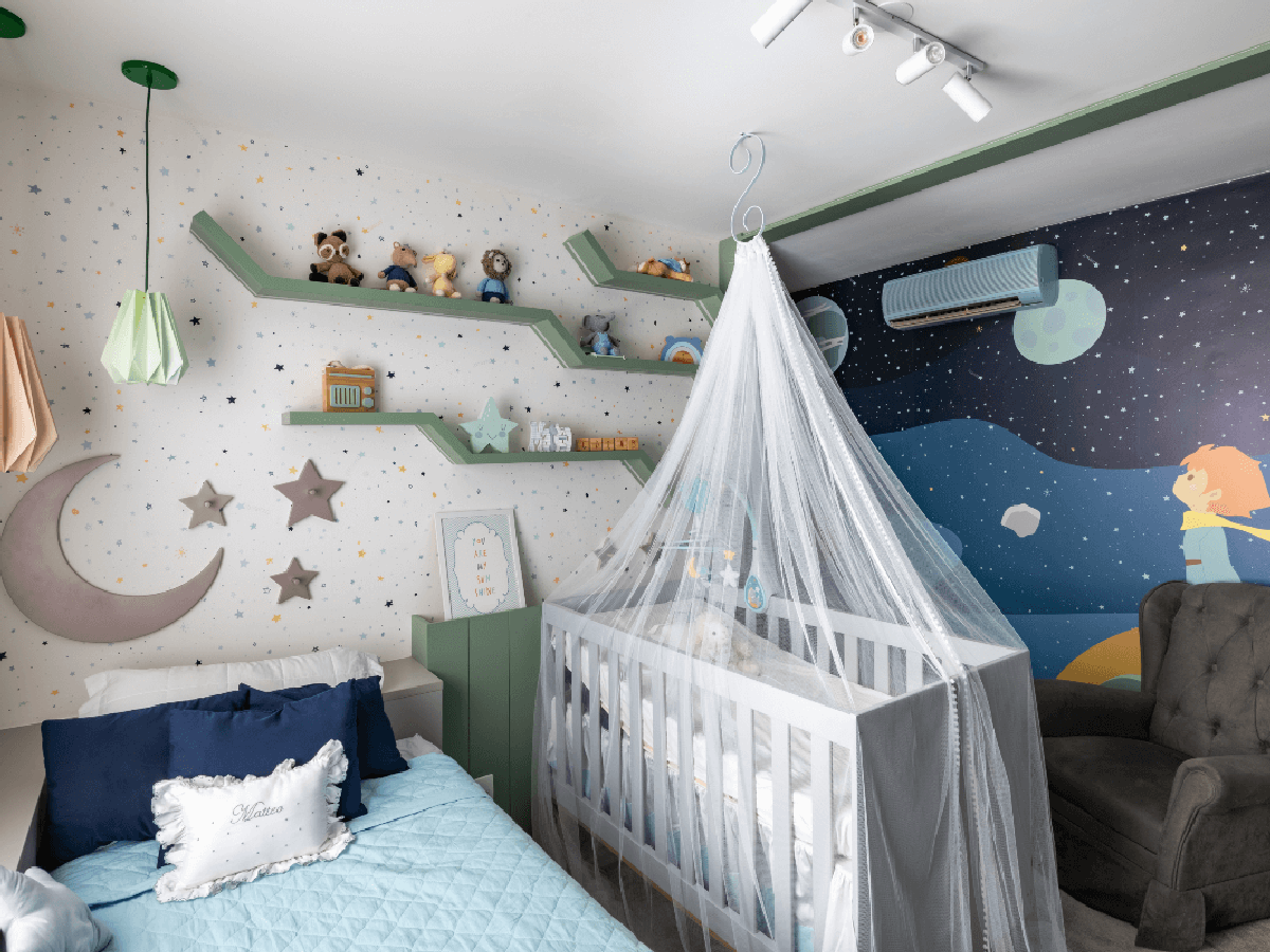 Convém apostar em papéis de parede que combinem com a proposta do quarto em questão, garantindo um ambiente leve, sem muitos estímulos visuais ou excesso de personagens nas paredes, como acontecia antigamente. "Nos nossos projetos, sempre pensamos que, assim como a área comum do apartamento, o quarto infantil também merece uma proposta atemporal, sem perder a delicadeza e os detalhes lindos", explicam.