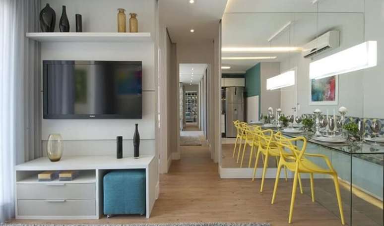 Os espelhos são um dos truques mais populares para aumentar a dimensão do ambiente e, quando bem posicionados, podem fazer milagres na decoração. O objeto é capaz de deixar o espaço mais arejado e causar sensação de amplitude. Paredes espelhadas e guarda-roupas com espelhos são sempre uma boa pedida para fazer o apartamento parecer maior.