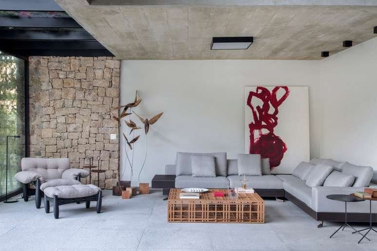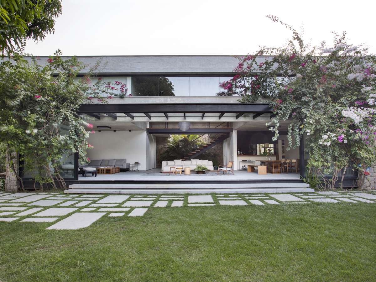A construção ganhou roupagem contemporânea, com linhas retas, grandes aberturas e concreto aparente. A inspiração no modernismo brasileiro também norteou uma paleta de materiais compostas por concreto armado, aço, pedras naturais e granitos.