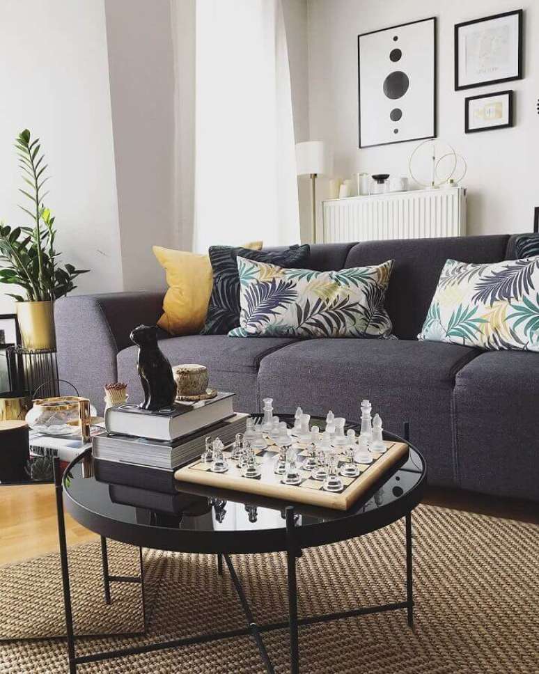 1. Almofadas para sofá cinza escuro em sala decorada com mesa de centro redonda – Foto: Corinne Miya