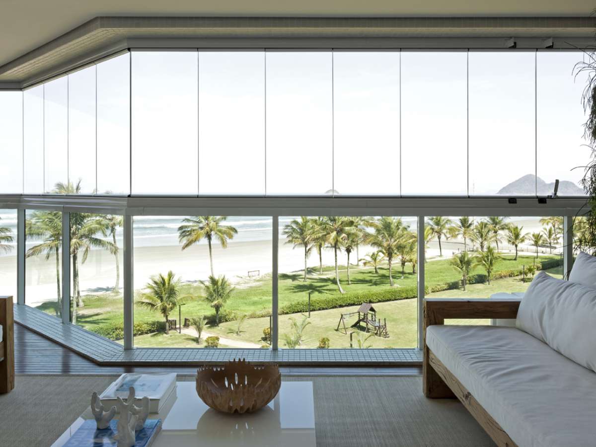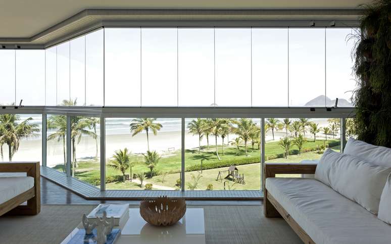 Localizado na Riviera de São Lourenço, o apartamento fica de frente para a praia, mas a decoração do imóvel é mais urbana