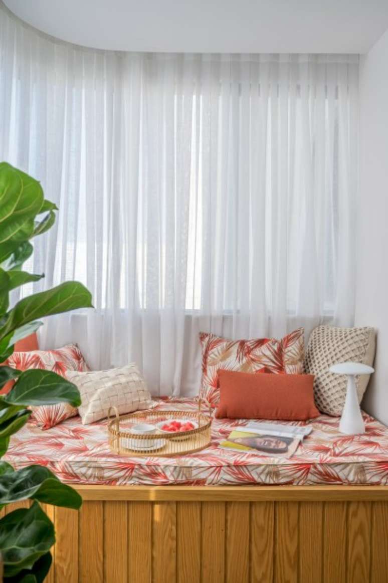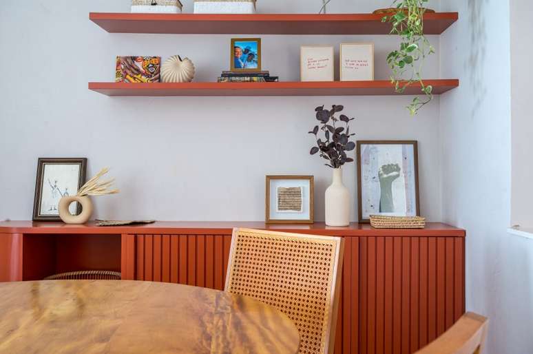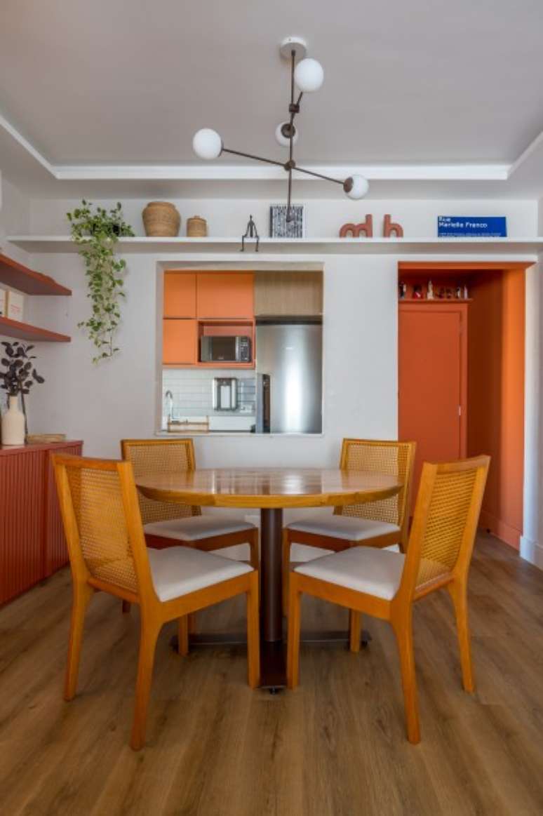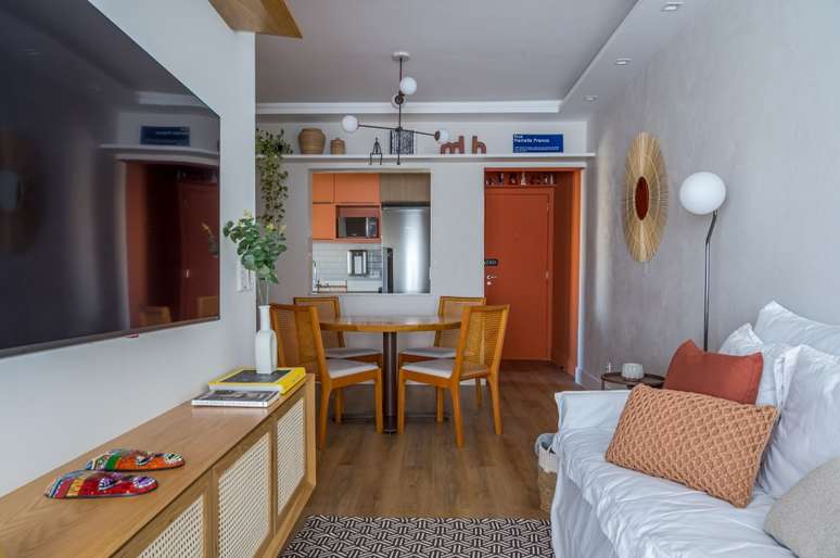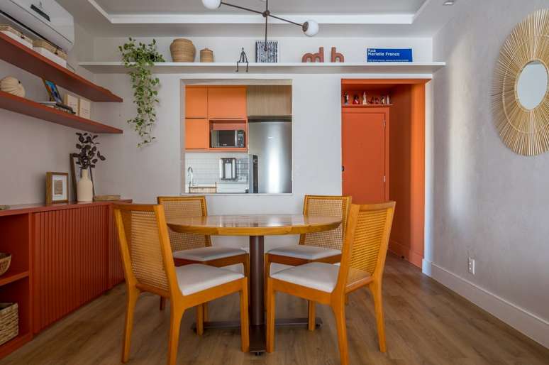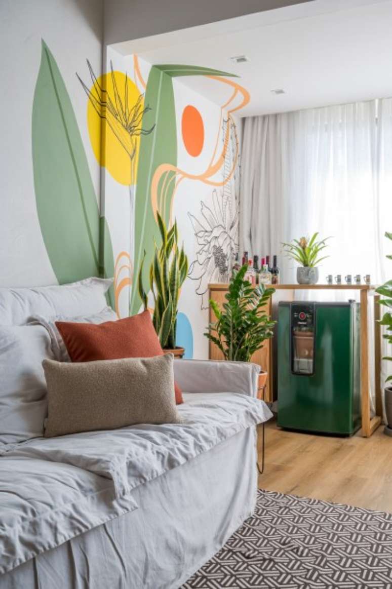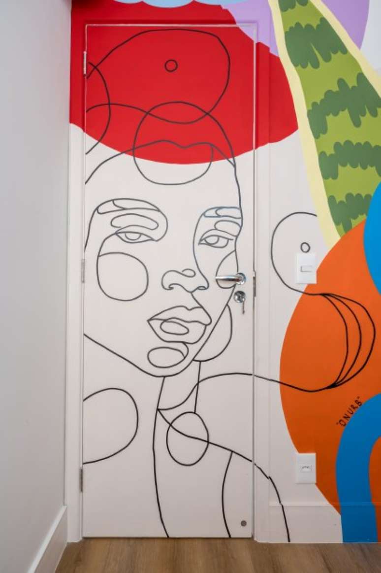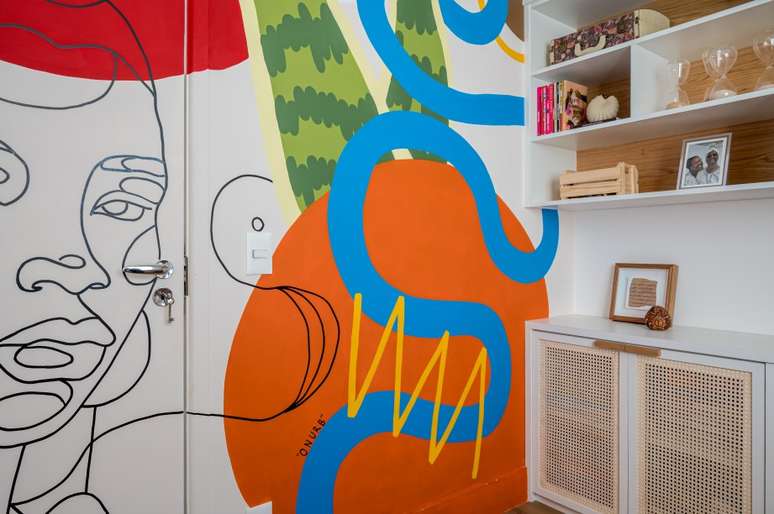 "Num curto espaço de tempo criamos um projeto cheio de cores, com pinturas artísticas nas paredes da sala e escritório, hall pintado de laranja e marcenaria multifuncional.", completa.