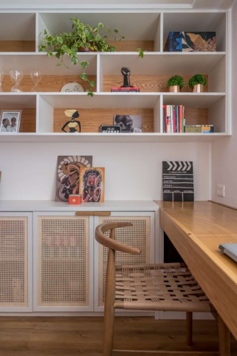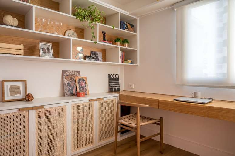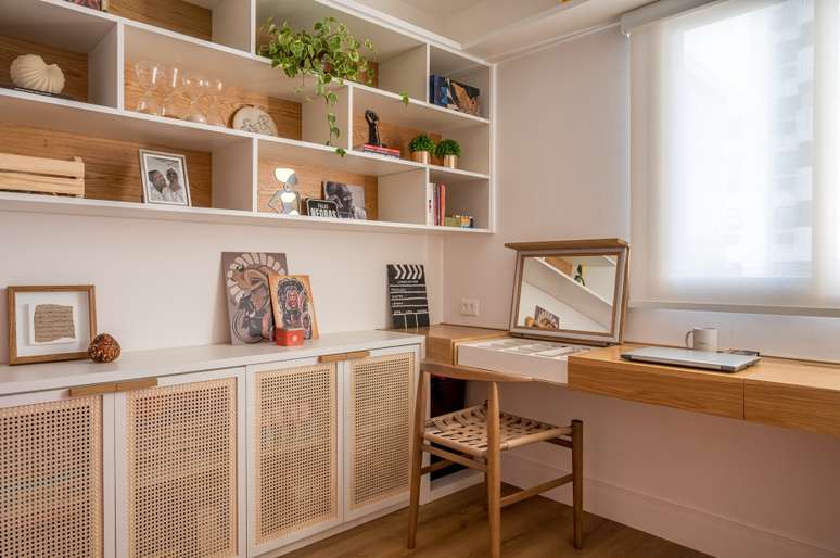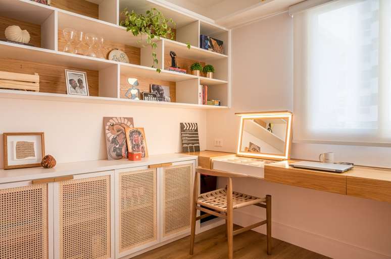 No escritório, que serve também de camarim e estúdio, uma grande estante feita sob medida em carvalho americano, tem prateleiras para livros e outros objetos, e portas com revestimento de palha Indiana sextavada natural, trazendo leveza ao ambiente. Uma ampla mesa de trabalho também funciona como canto de maquiagem, abrigando uma penteadeira retrátil que conta com espelho e iluminação.