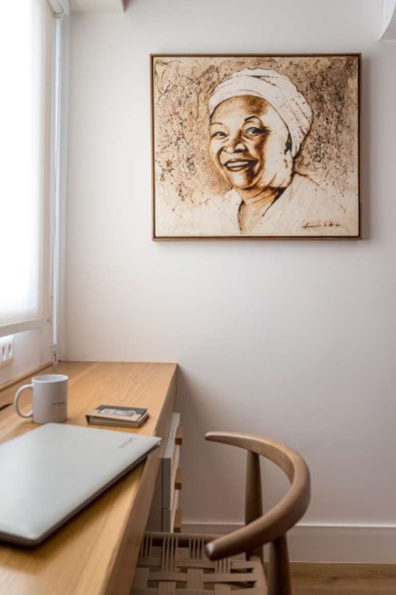 No lado oposto, a parede tem uma pintura artística com temas e cores que servem de cenário para as suas gravações. Para que tudo funcionasse perfeitamente, Paula providenciou um isolamento acústico em todo o cômodo para servir como um estúdio. Mas o destaque deste ambiente é o quadro que retrata sua avó, a também atriz: Chica Xavier.