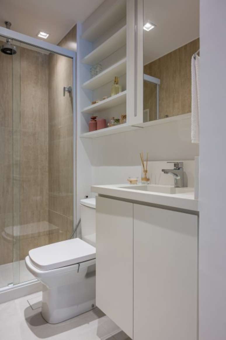 Dois banheiros pequenos foram bem aproveitados, com marcenaria sob medida e espaços projetados para organizar e destacar os produtos de marcas parceiras da artista. As bancadas de quartzo branco e o piso e paredes de porcelanato são de fácil conservação.