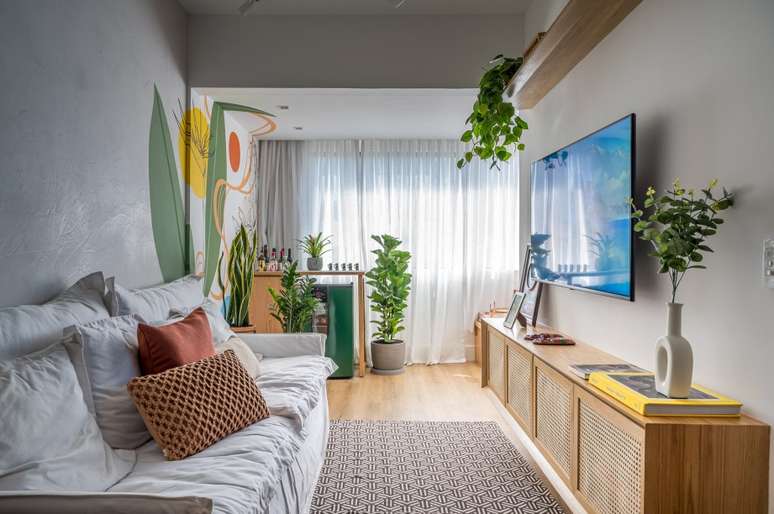 " Integramos a cozinha e sala com um grande vão entre os ambientes e também a sala com a varanda, nivelando pisos e fechando a varanda com vidro. Esse ambiente conta com sala de jantar, sala de TV, bar e espaço de relaxamento com futon. O destaque é a pintura personalizada na parede feita por um artista amigo de Luana, Bruno Pedriali", diz Paula.