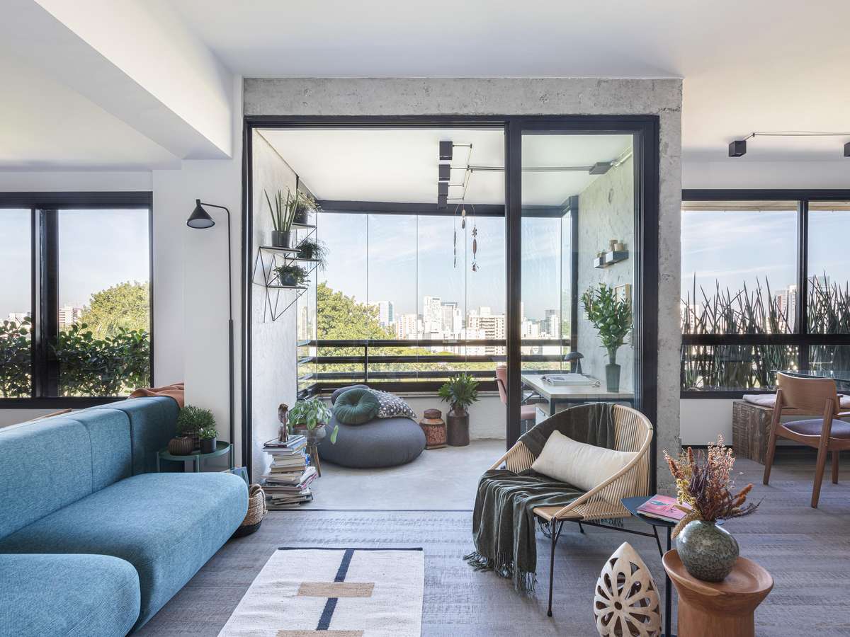 No living do apartamento, temos a sala de estar, jantar, TV e cozinha - todos esses ambientes estão integrados. O lavabo está camuflado em uma porta mimetizada que fica no grande painel da cozinha. O escritório fica na varanda. As duas suítes estão na área íntima do apartamento. A área de serviço fica escondida atrás da cozinha.