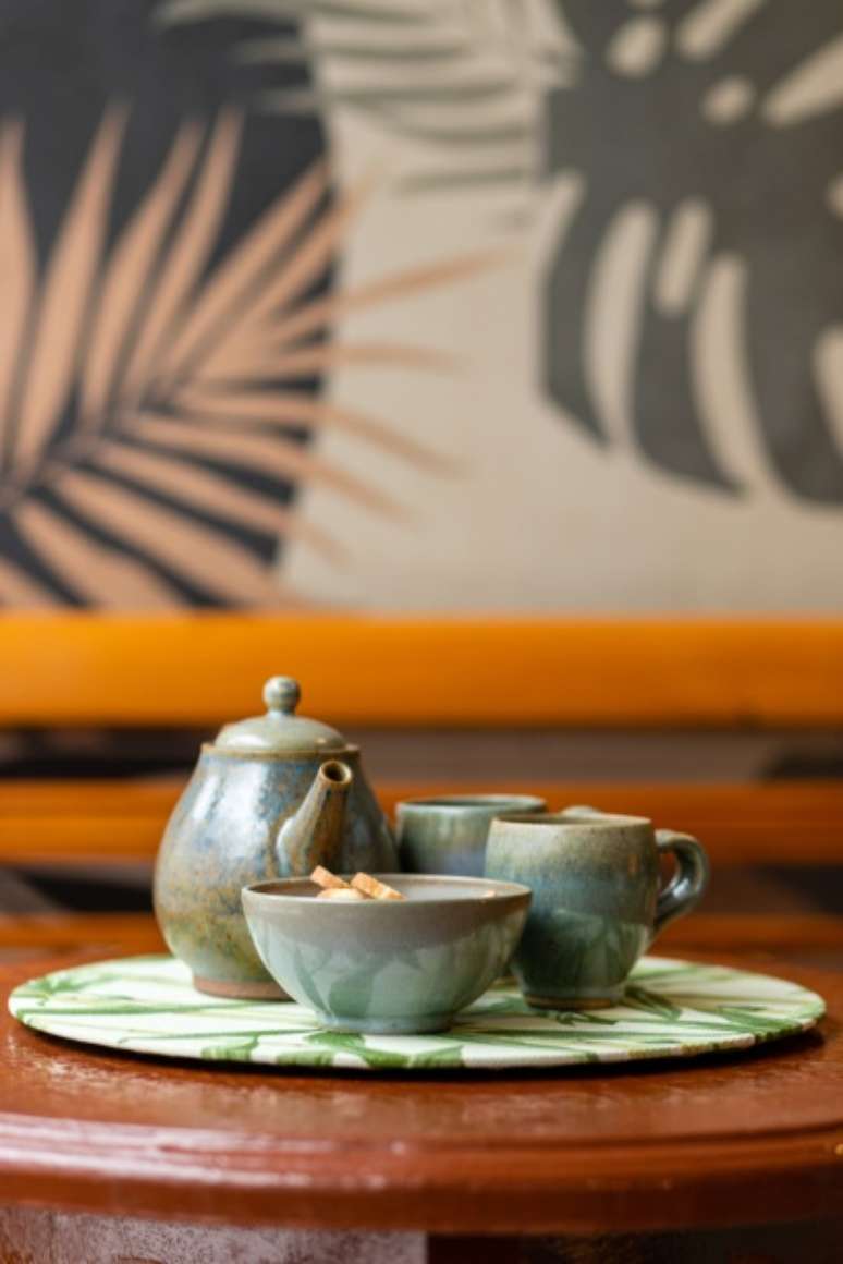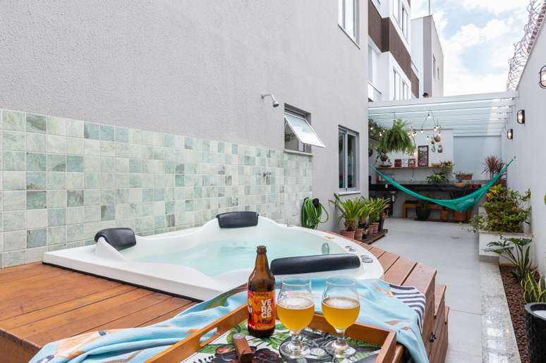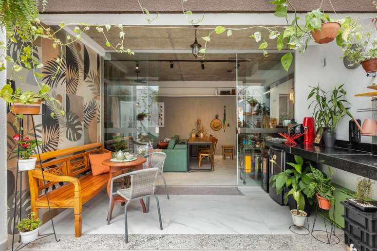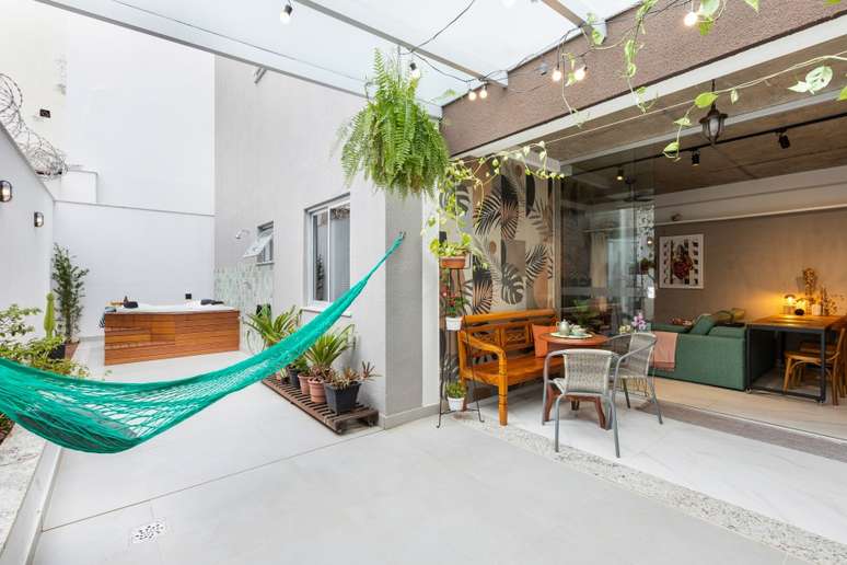A varanda e o terraço contam com muitas plantas, tanto no chão quanto na jardineira, penduradas no pergolado e até mesmo nas estampas do revestimento. Ali também fica o spa da casa, com capacidade para três pessoas.