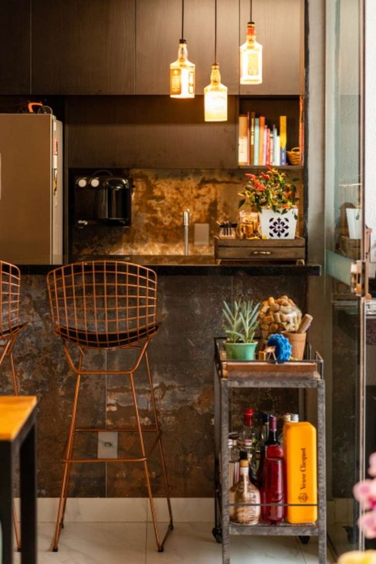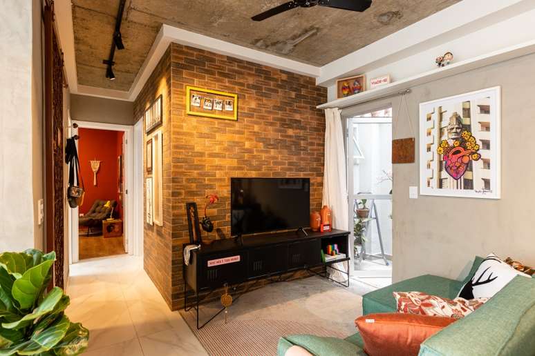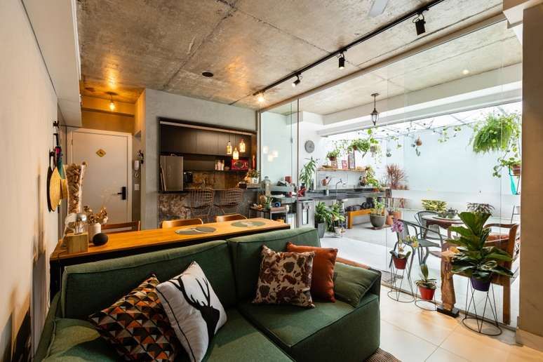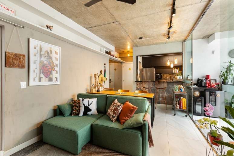 Na área social a paleta de cores é quente e alegre. Tons terrosos e verdes equilibram o concreto, metais e toques pretos presentes na cozinha e no teto. O destaque fica por conta do sofá verde que acompanha a parede de tijolinhos (na realidade um revestimento de porcelanato).