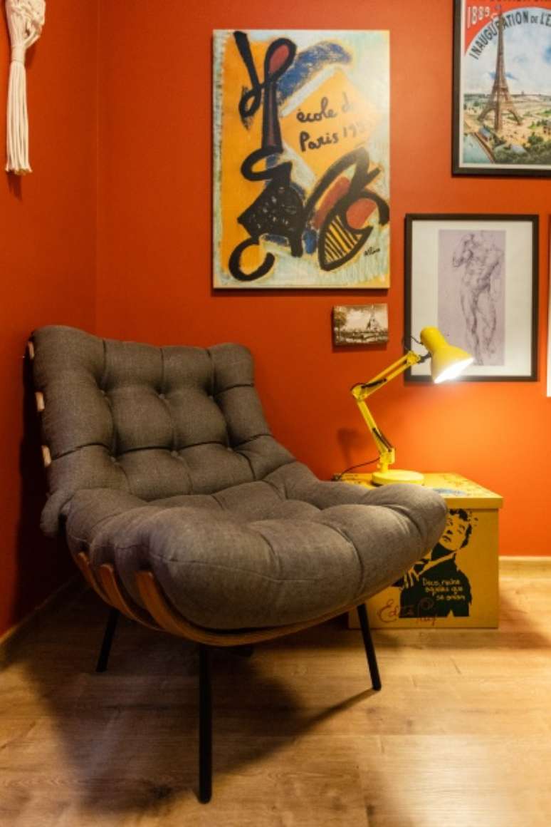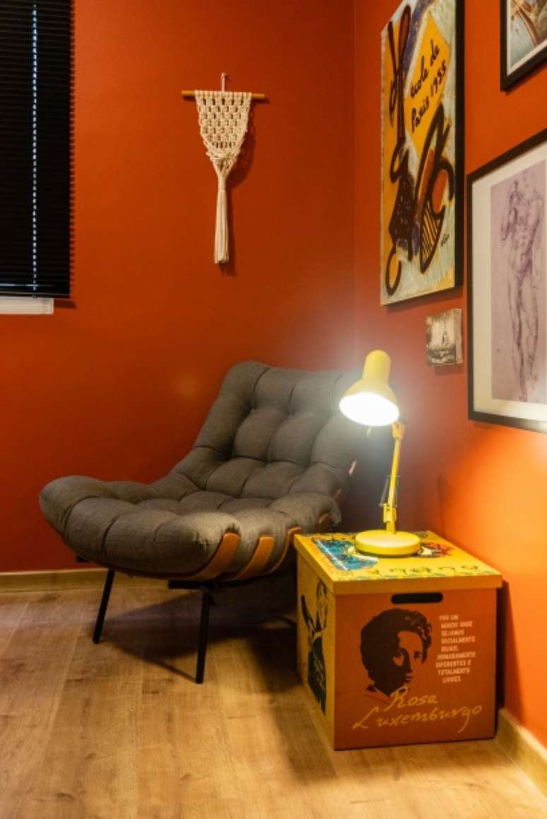 Um dos quartos foi convertido em um home office com paredes vermelhas e uma poltrona costela para criar um cantinho de leitura.