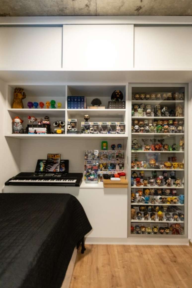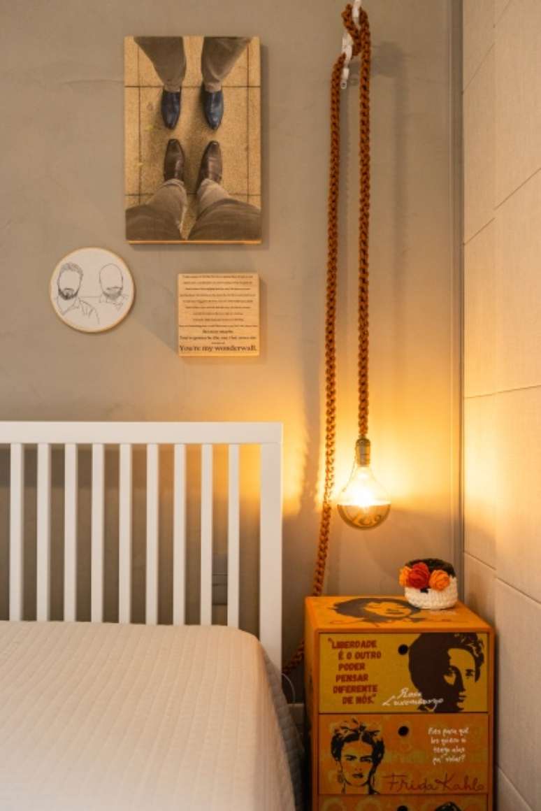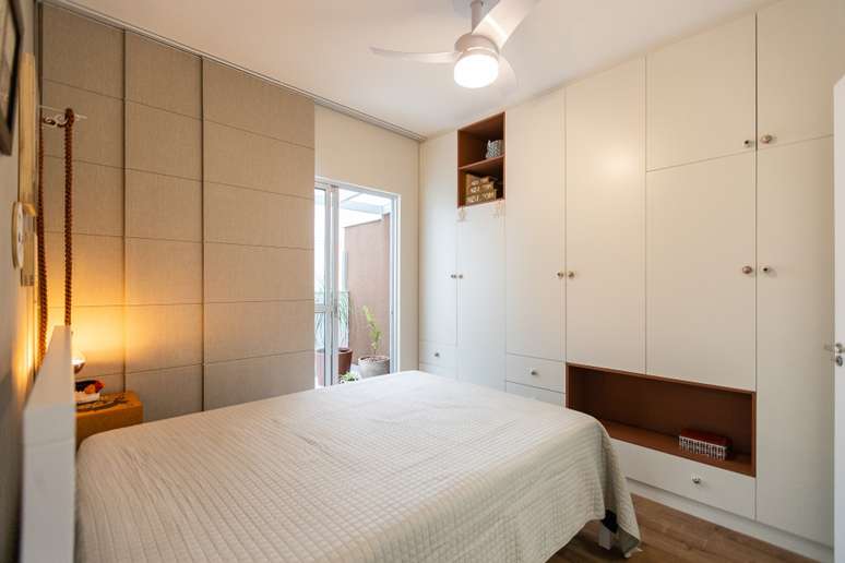 Já a suíte do casal recebeu uma decoração mais sóbria, mas seguindo a paleta de cores. "O guarda-roupa com portas geométricas e nada simétricas ficou bem impactante, e precisava ser, dado que é a primeira impressão do espaço. Na parede da cabeceira uma composição de quadros e memórias afetivas criou um espaço com muita harmonia. Sim, no quarto também há um terraço e também temos ali plantas a propiciar um melhor ambiente", conta João.