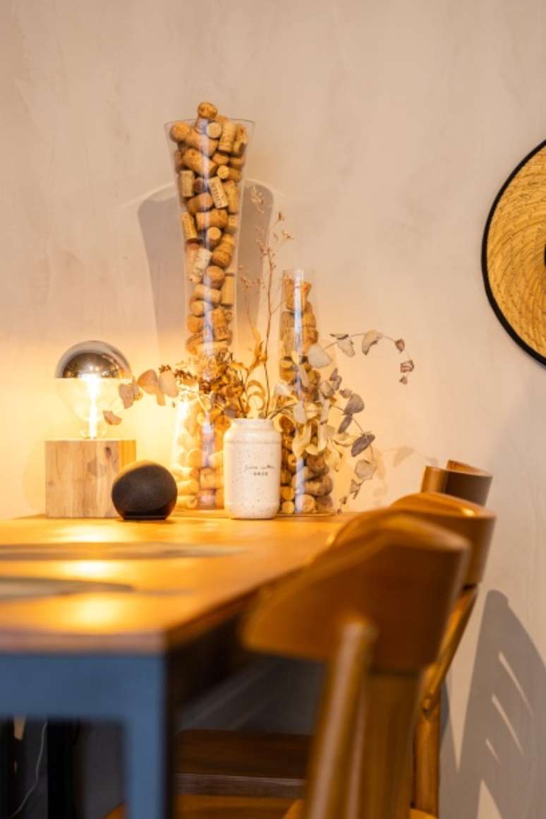 A sala de estar e varanda foram pensadas para receber amigos e família, além de acolher festas. Para ter o máximo de espaço possível, a mesa de jantar foi dispensada e, em seu lugar, foi utilizado um aparador com rodízios, que pode ser transportado e posicionado de acordo com a necessidade do momento.