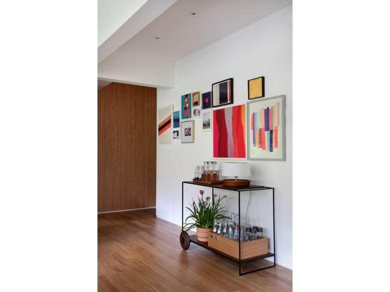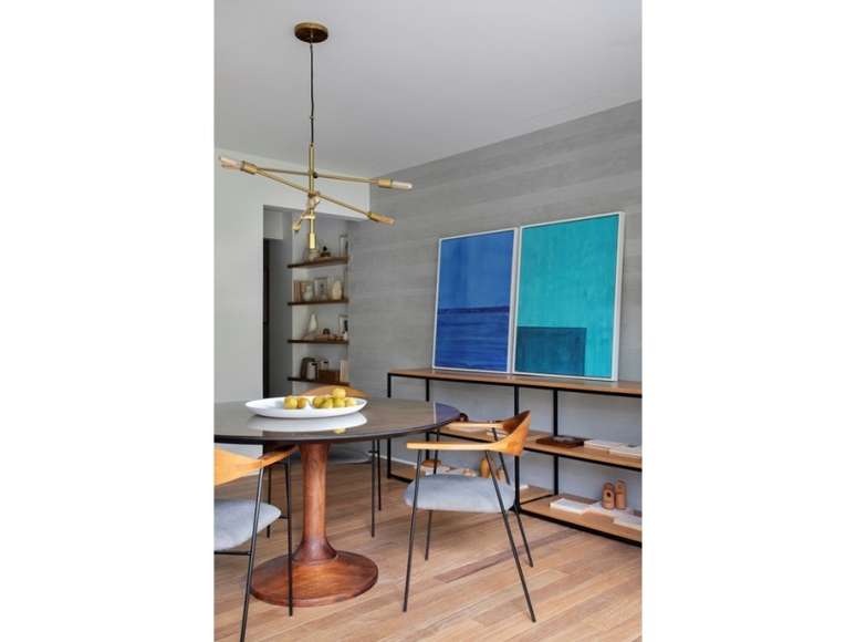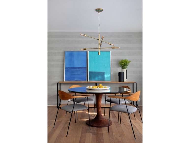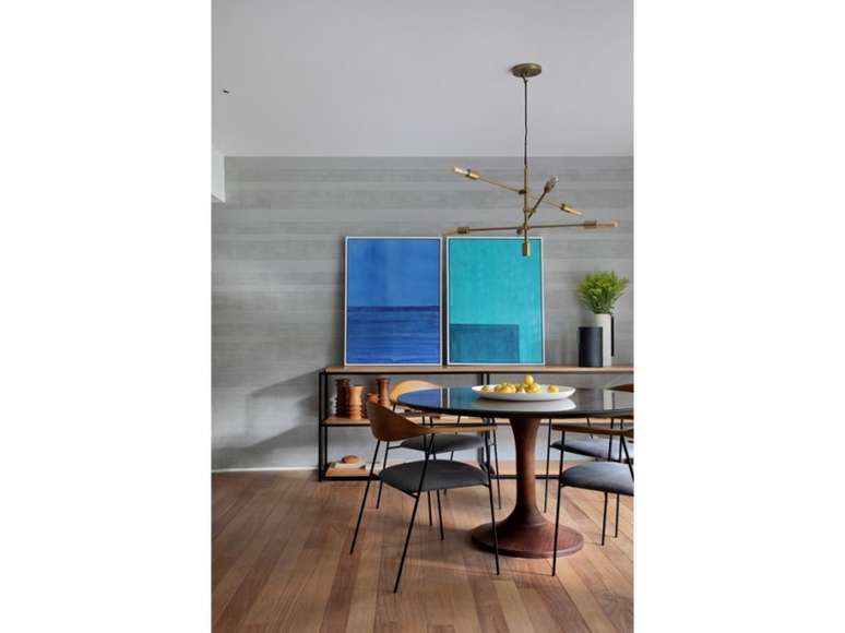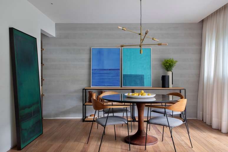 As cores aparecem em tons suaves nas almofadas e vibrantes na gallery wall da entrada e no verde das plantas. Na sala de jantar, a cor também se faz presente através dos dois quadros apoiados no aparador, contrastando com a textura cimentícia da parede ao fundo, que imita réguas de concreto.