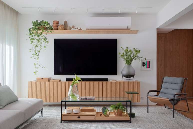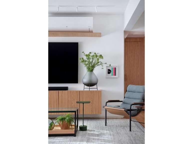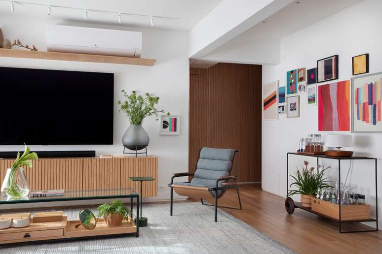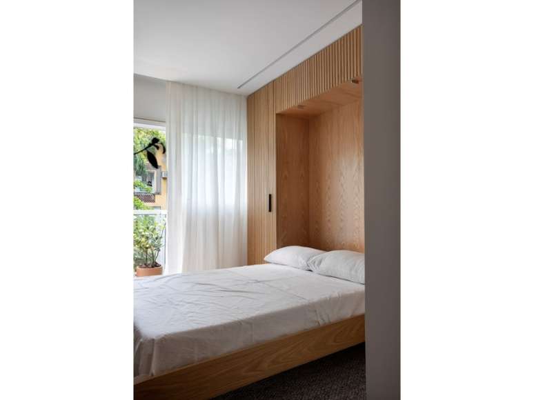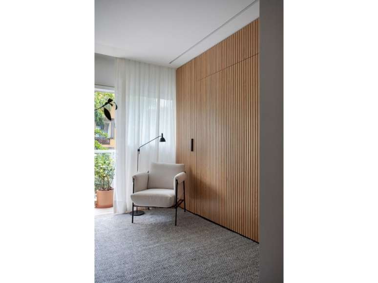 Apê de 160m² tem cama retrátil "escondida" em painel de madeira ripada