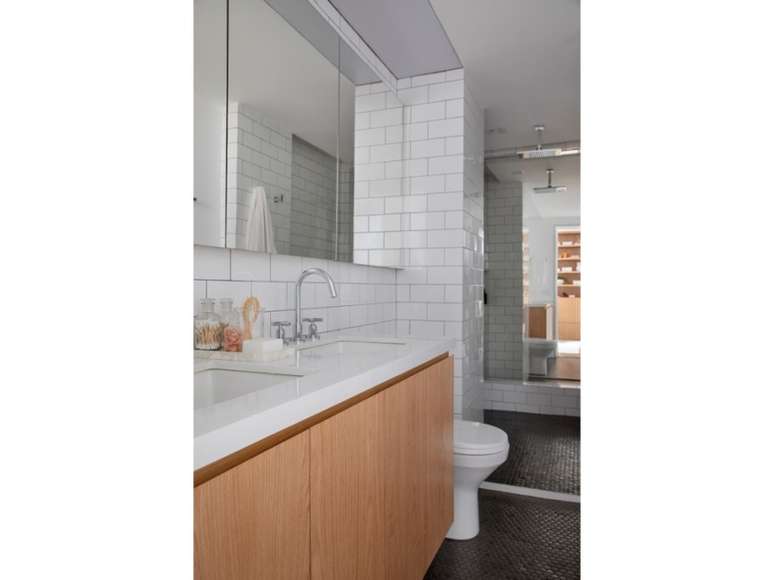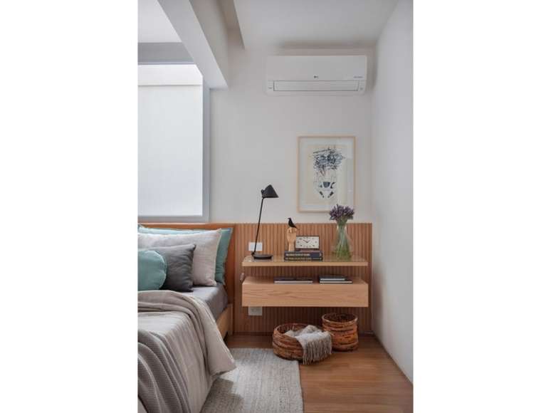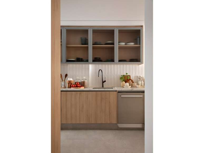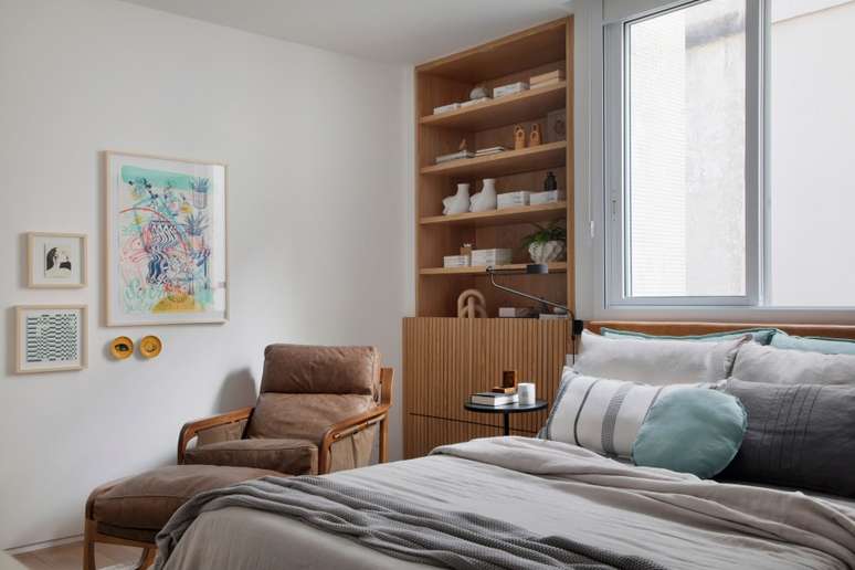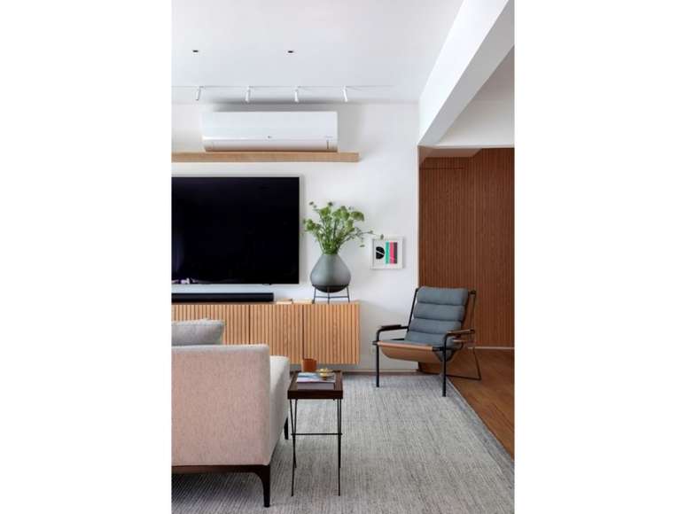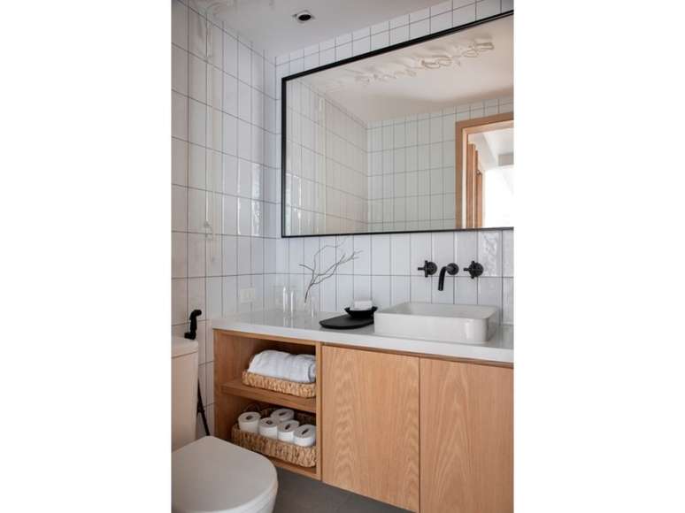 Aqui, a linguagem estética e a escolha de materiais seguem o padrão adotado na sala, com uma base mais neutra, permeada por madeira, cinza e branco.