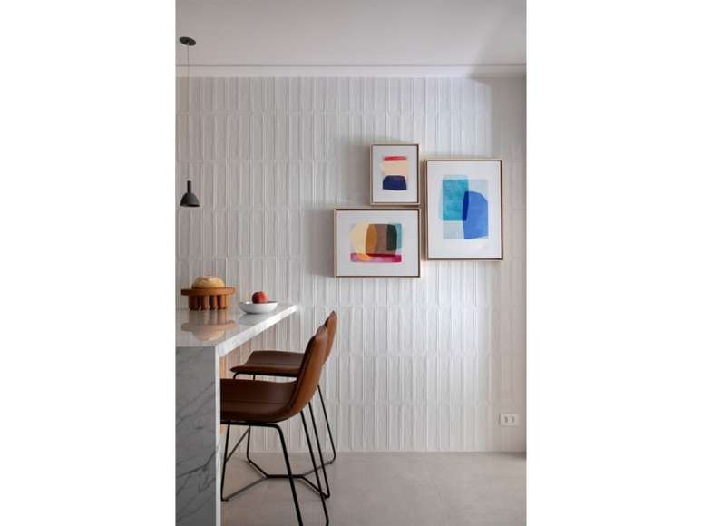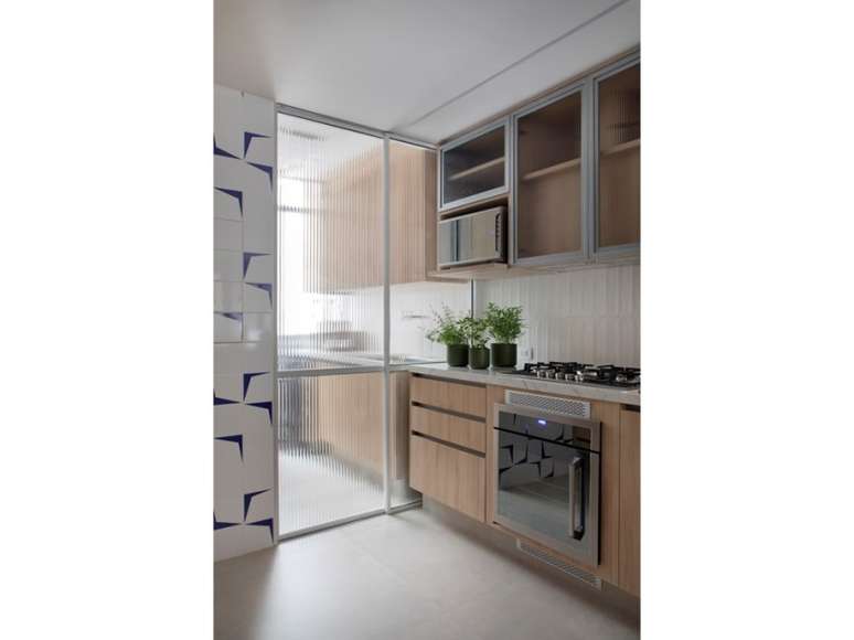 A cozinha possui bancadas de Ultracompact em L, com direito a espaço para refeições rápidas, e um painel de azulejos com estampa modernista azul, que remete a andorinhas.