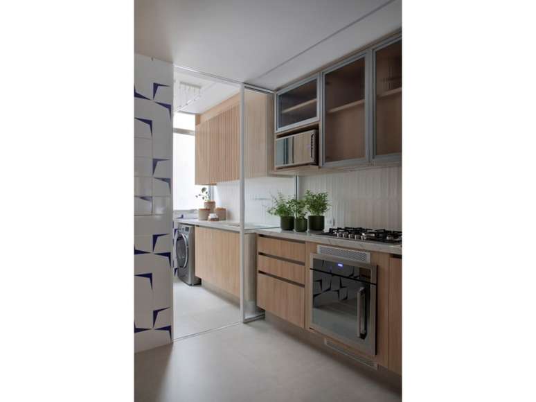 Cozinha e área de serviço estão separadas apenas por uma porta de correr, executada em serralheria preta com vidro canelado, permitindo não só a integração dos espaços (quando necessário) como também a presença de luz natural que vem da janela próxima à máquina de lavar.