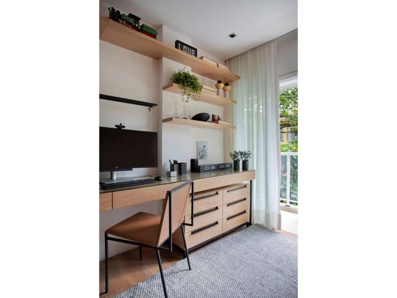 Outro destaque no apartamento é o quarto transformando em escritório, adaptado para acomodar hóspedes. Como o cliente queria um pano de fundo bacana para as reuniões online e ele não gostava da ideia de usar um sofá-cama destinado aos hóspedes, os arquitetos projetaram uma cama retrátil camuflada em um painel ripado, ladeada ainda por dois módulos de armário.