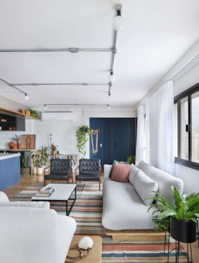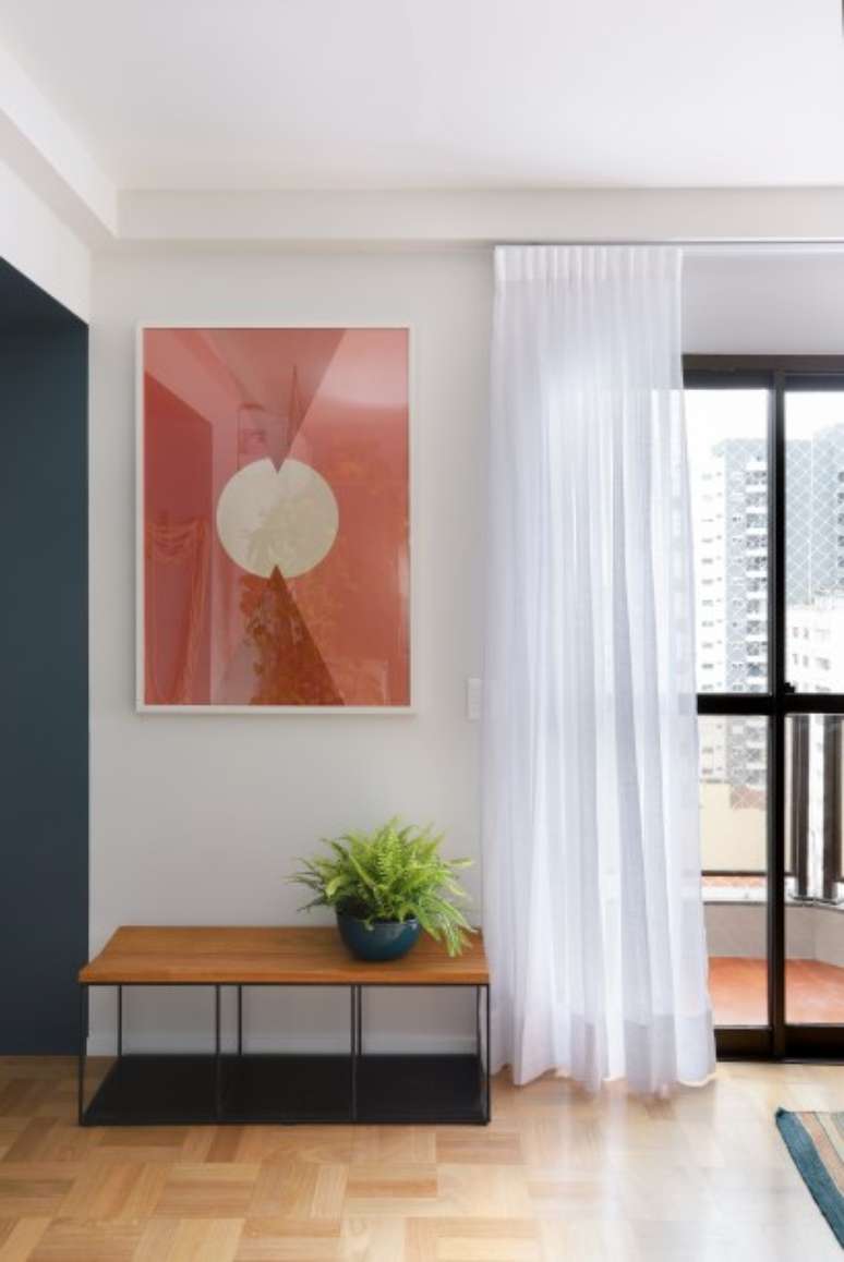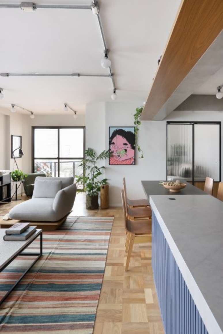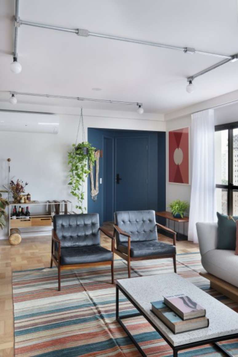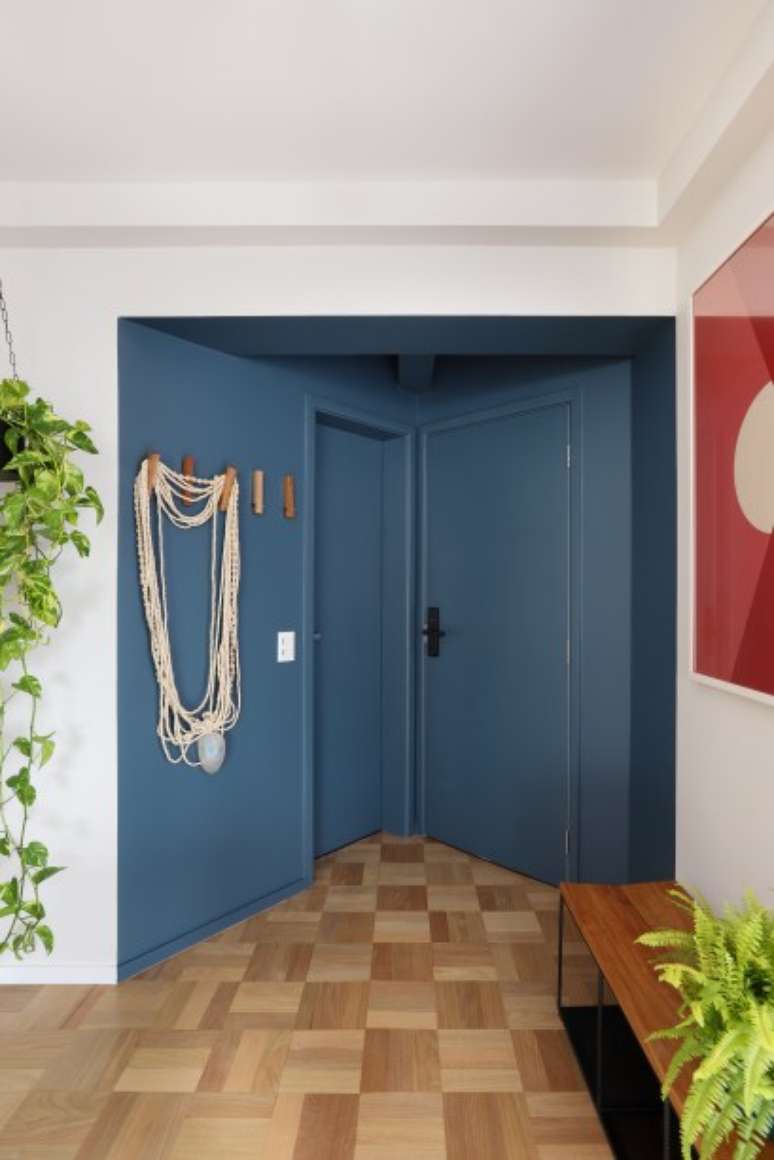 Apê de 180m² ganha color block azul na entrada e área de descompressão