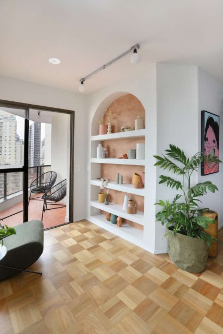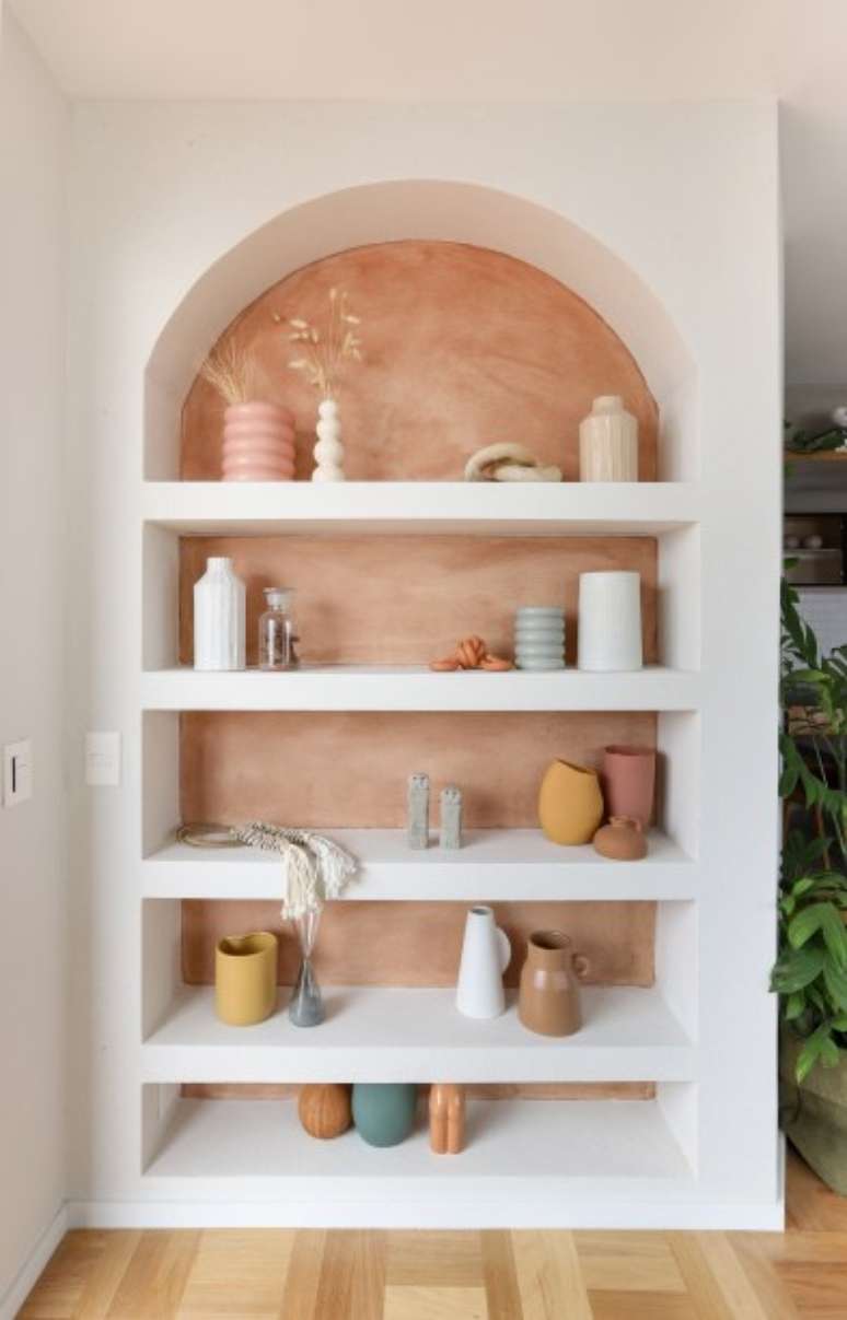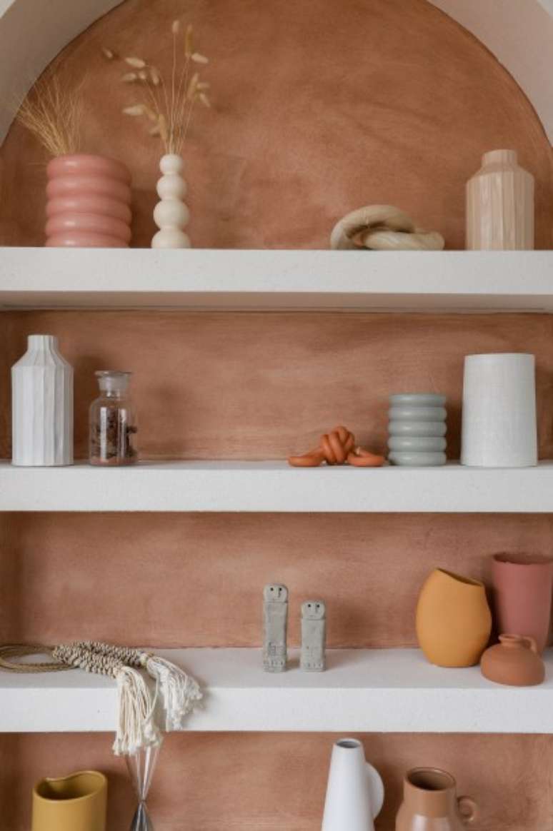 As prateleiras foram criadas em drywall e pintadas com textura de limestone e a parte interna recebeu textura de terracal trazendo para o ambiente um ar de estilo Boho.